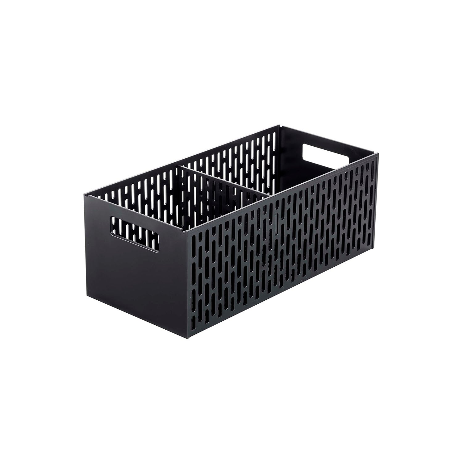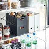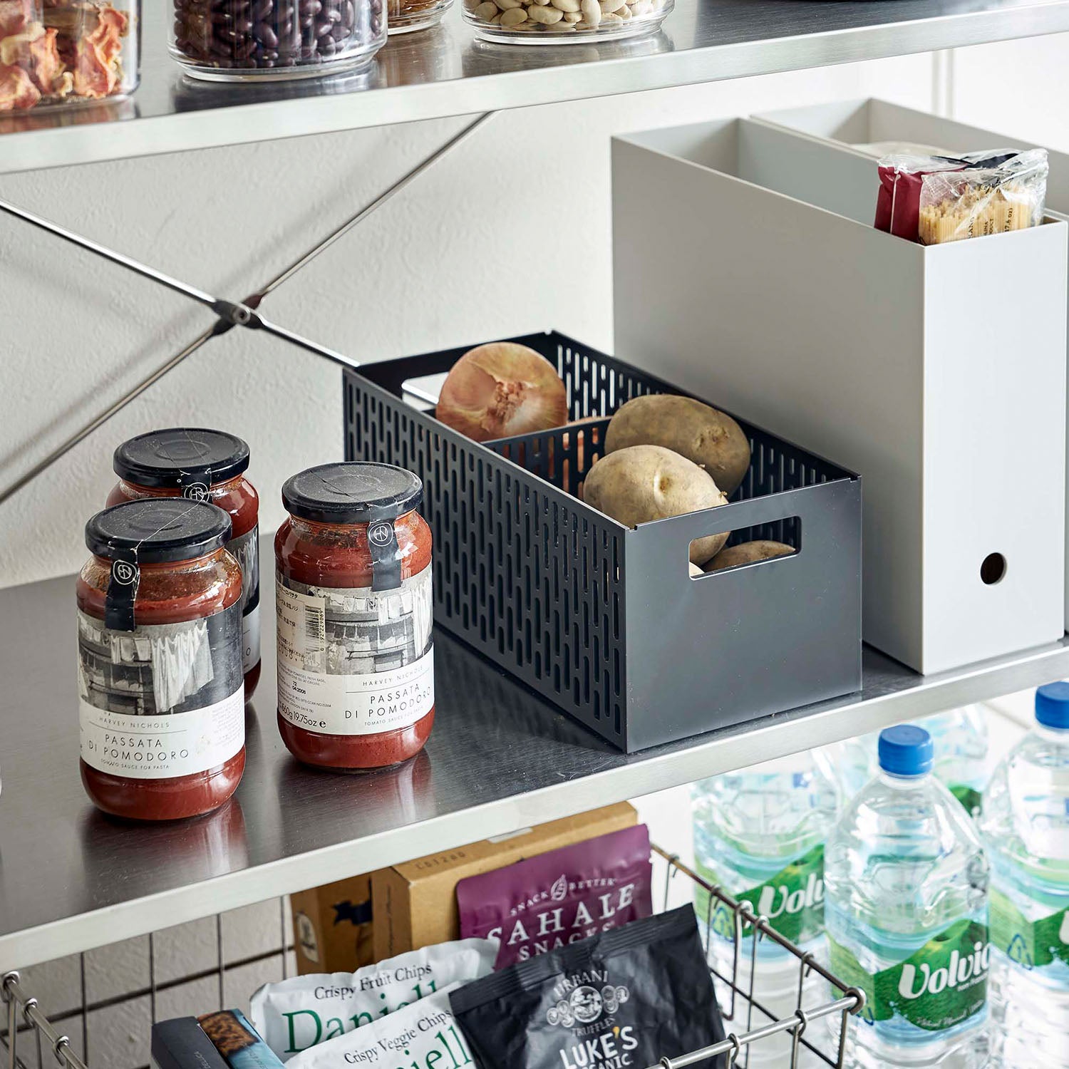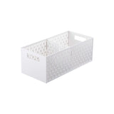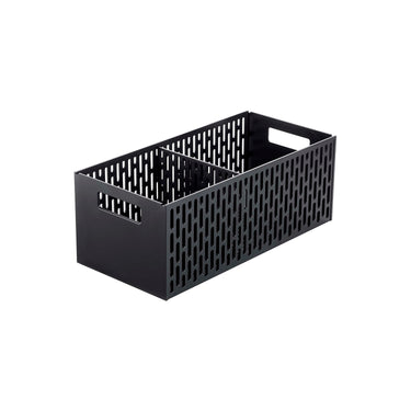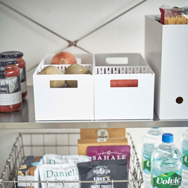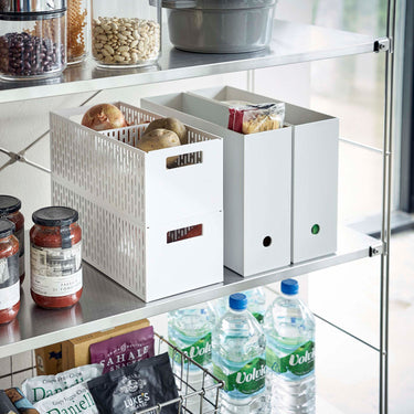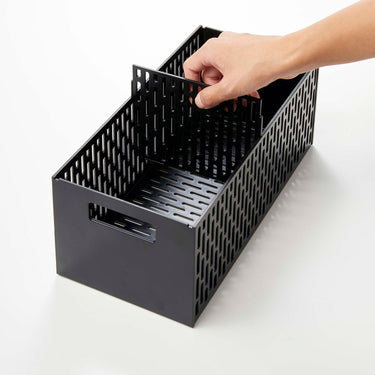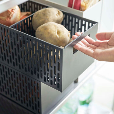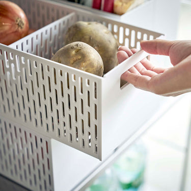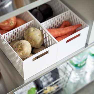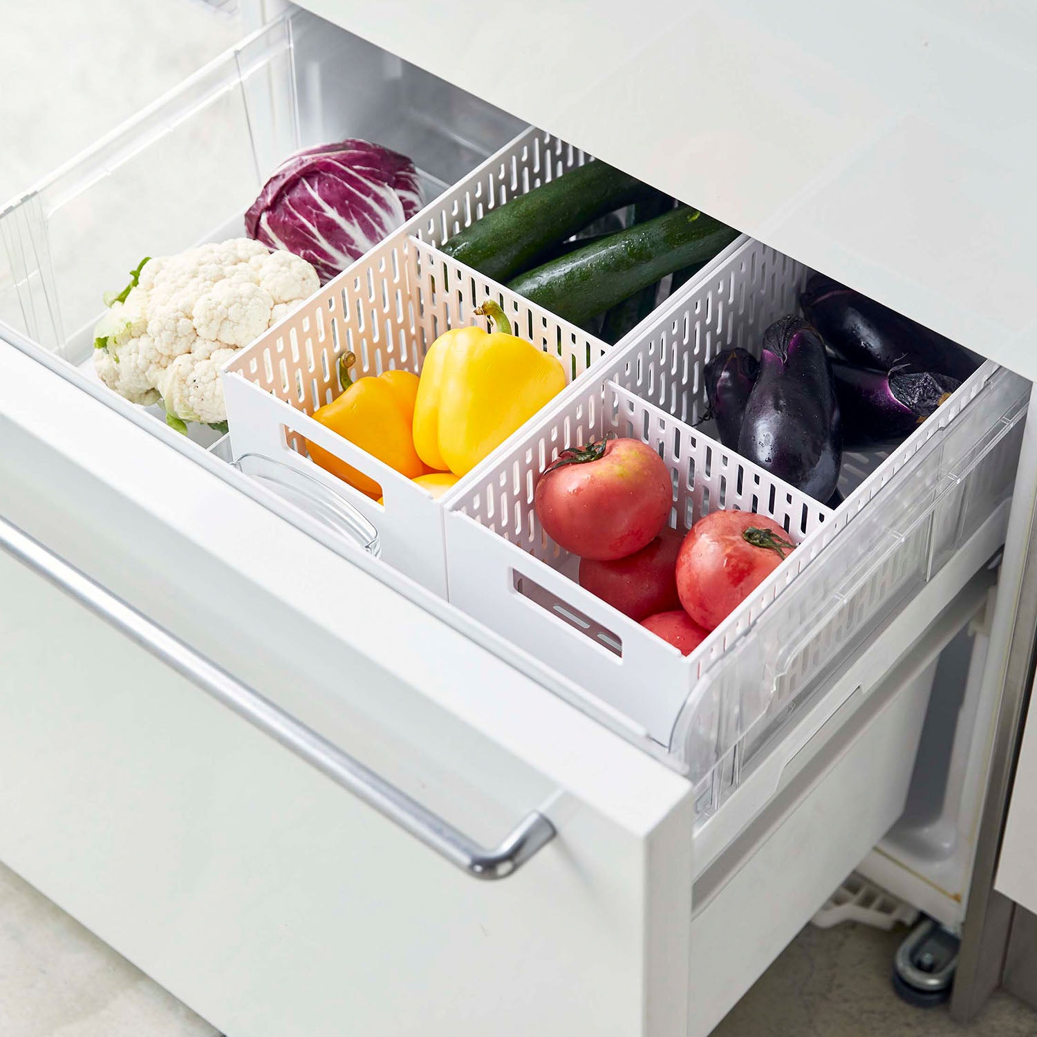 This simple storage box is perfect for storing vegetables. The position of the dividers can be adjusted to fit the size of your vegetables for neat storage. You can stack up to two boxes for even more convenience! Simply hold the handle of the upper stacked box and slide it out. Except for the front and back, the box is ventilated with holes, ensuring excellent breathability. It's also handy for organising the vegetable compartment of your fridge.