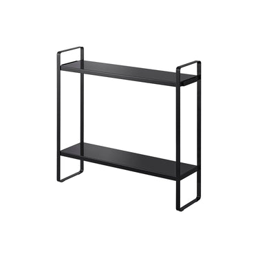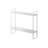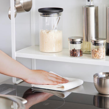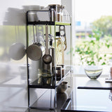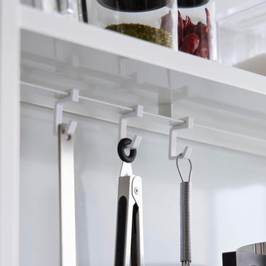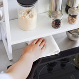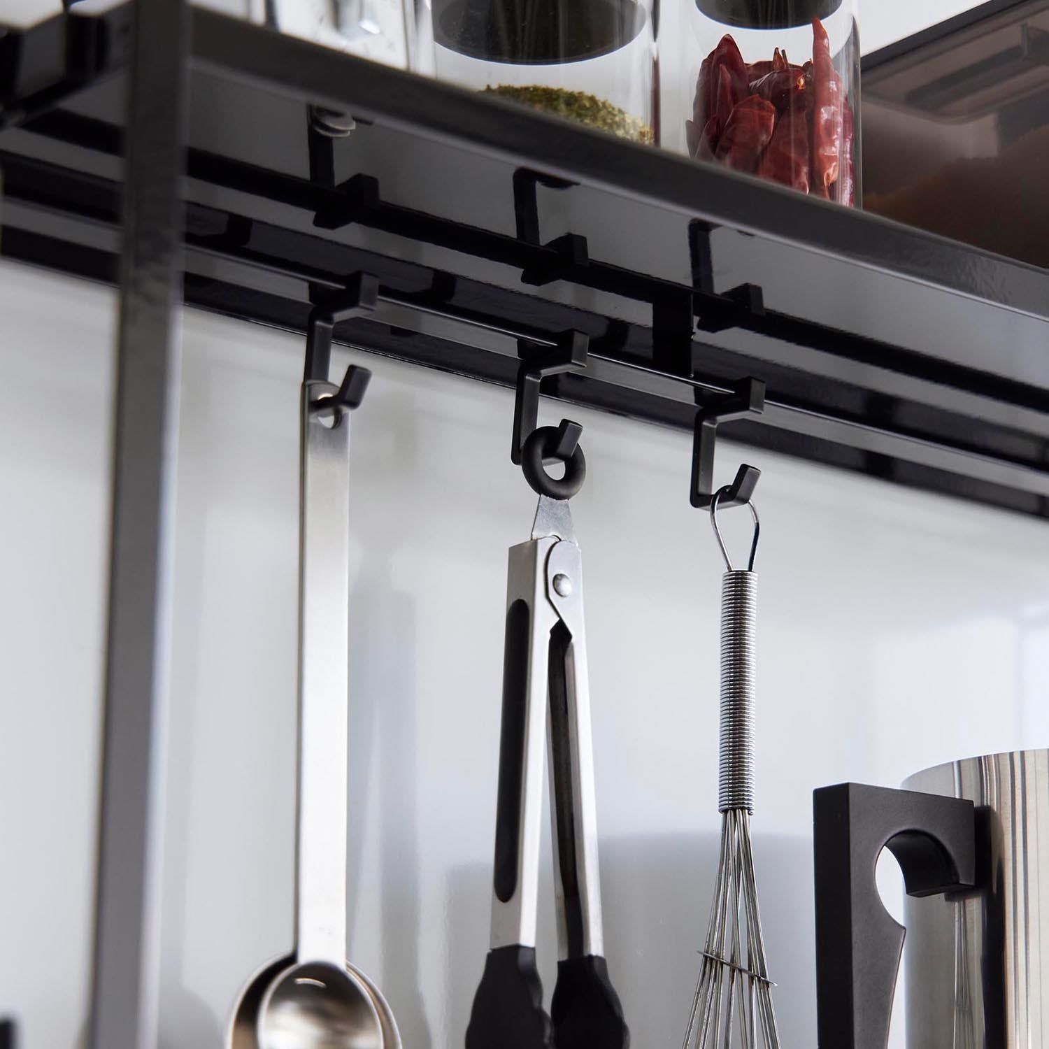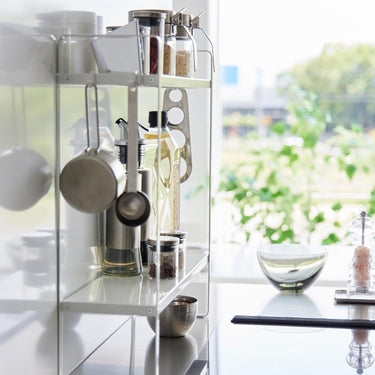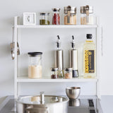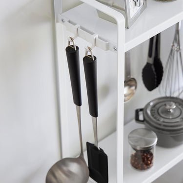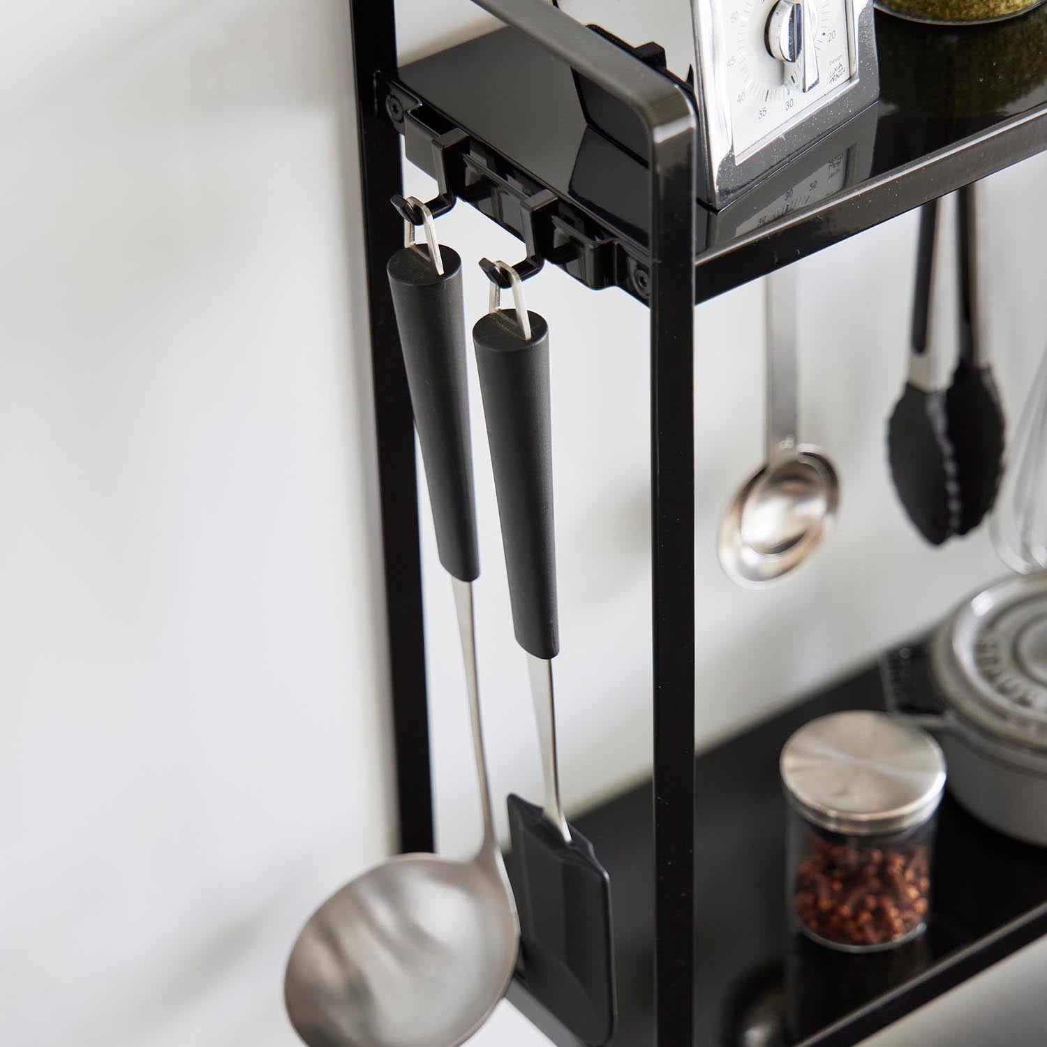 This rack, with a depth of approximately 14cm, fits neatly next to your stove. Its two-tiered design allows you to store items such as measuring spoons and tall seasoning containers, helping to keep your kitchen tidy. The rack is approximately 10cm high from the installation surface, making it easy to wipe underneath and maintain. Hooks can be attached to the bar under the shelf or to the side, depending on your preference, allowing for hanging storage.