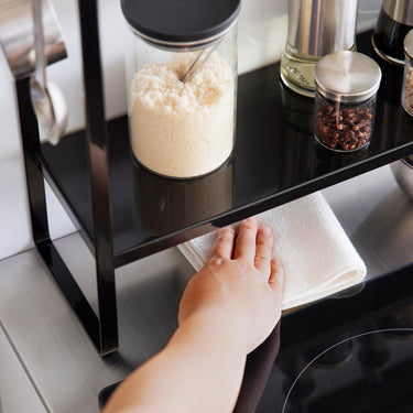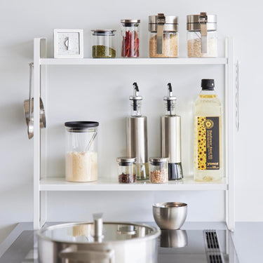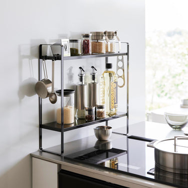 A two-tier storage rack that can neatly store all your condiments and kitchen tools next to the stove.