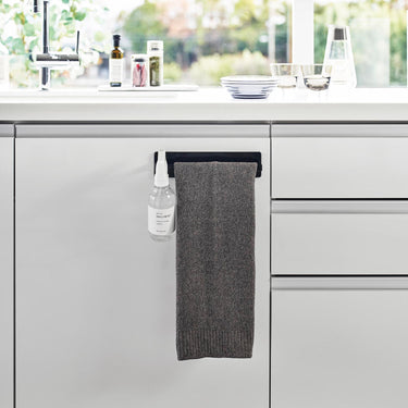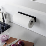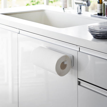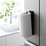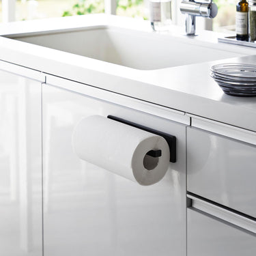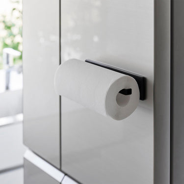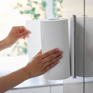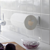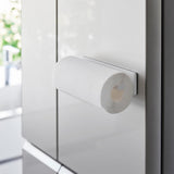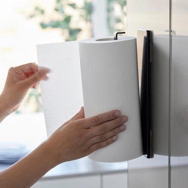 A kitchen paper holder that can be easily attached to your preferred location using film hooks.