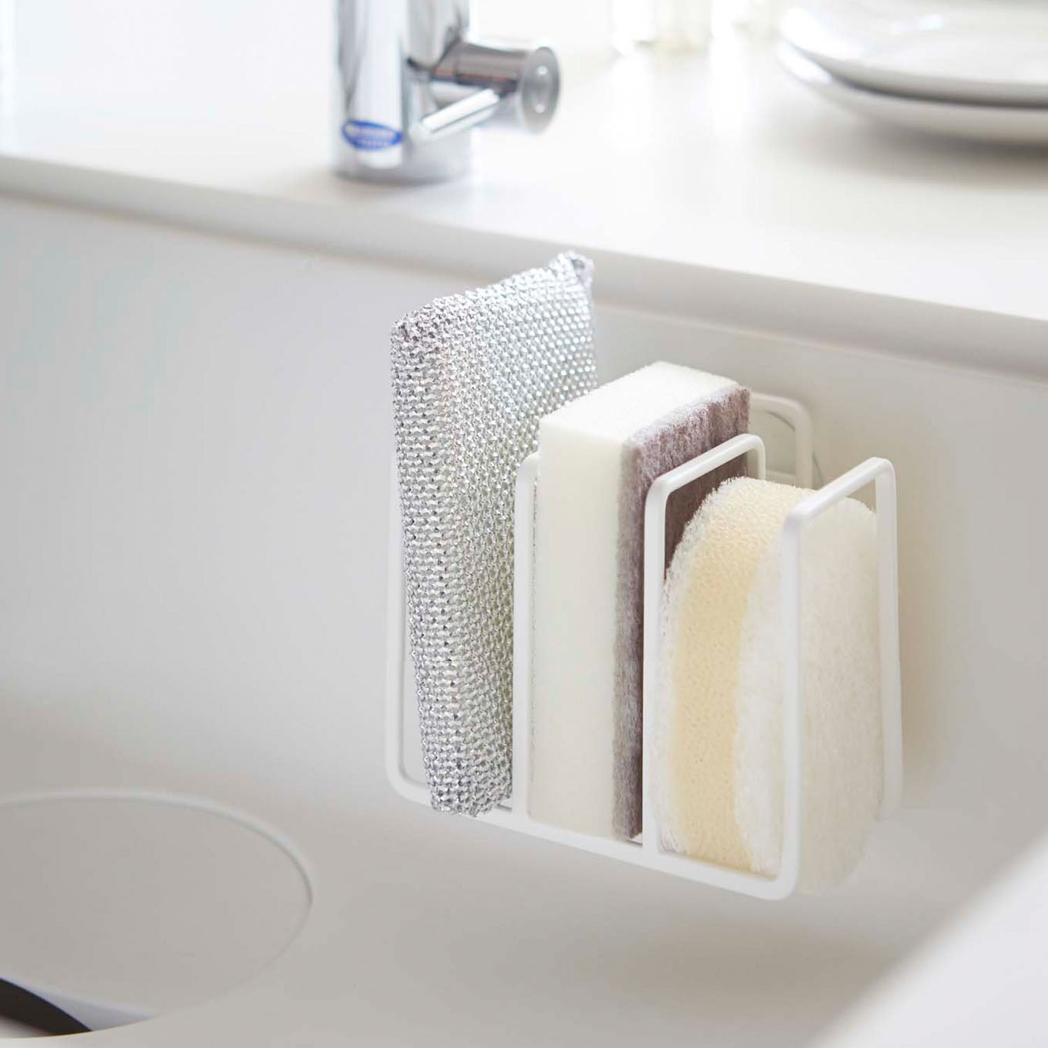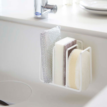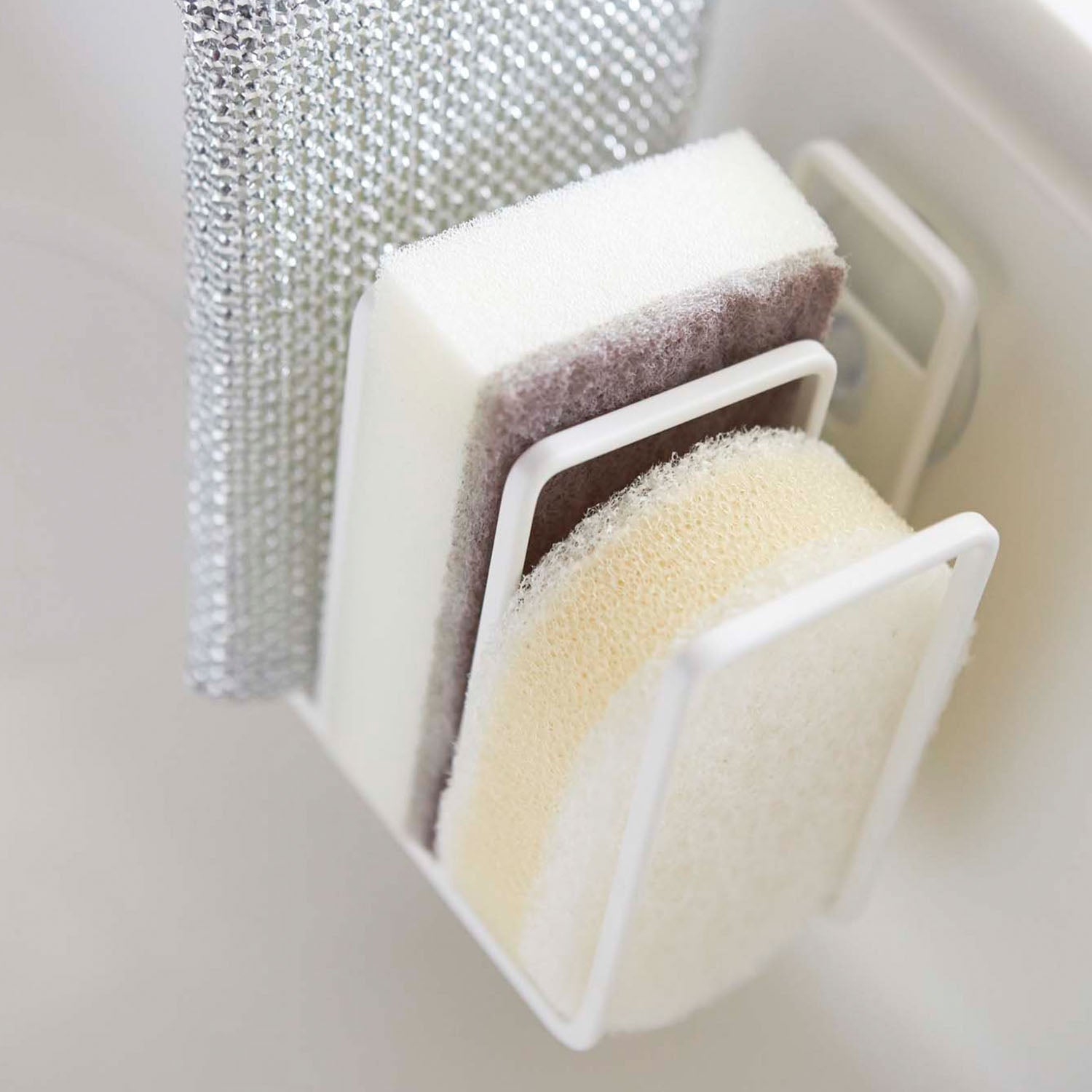 A handy sponge holder that can be used in the sink thanks to its suction cup. With the capacity to hold three sponges, it allows for easy differentiation based on the type and purpose of the sponge.