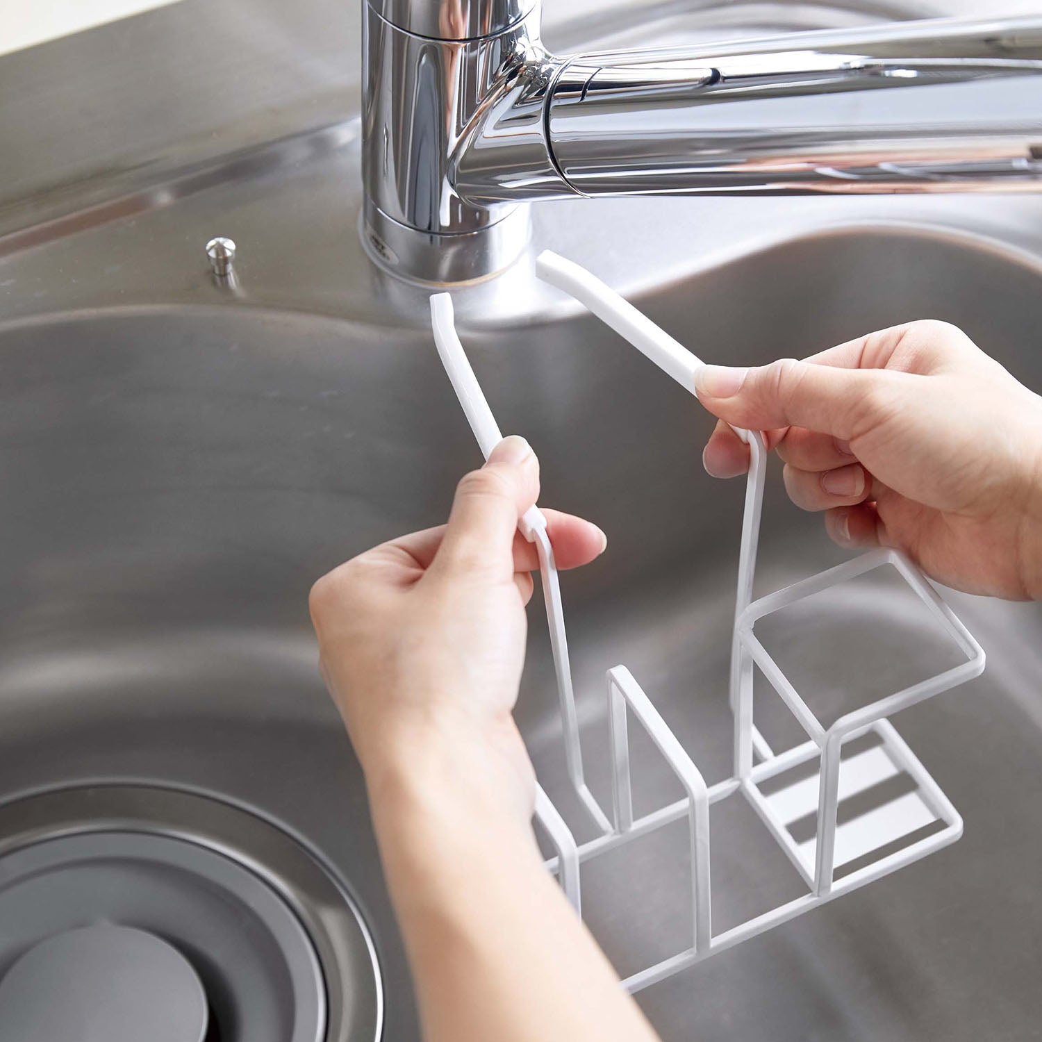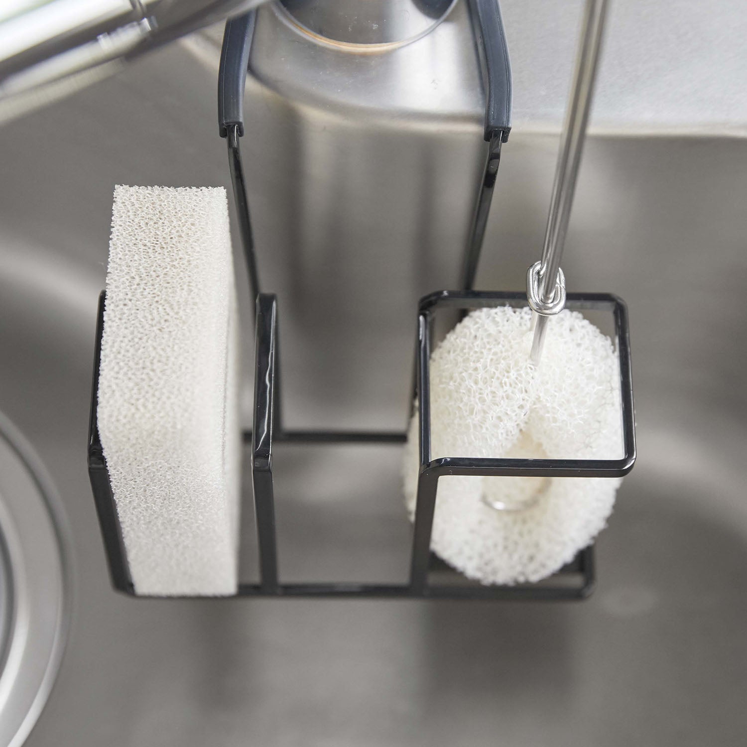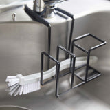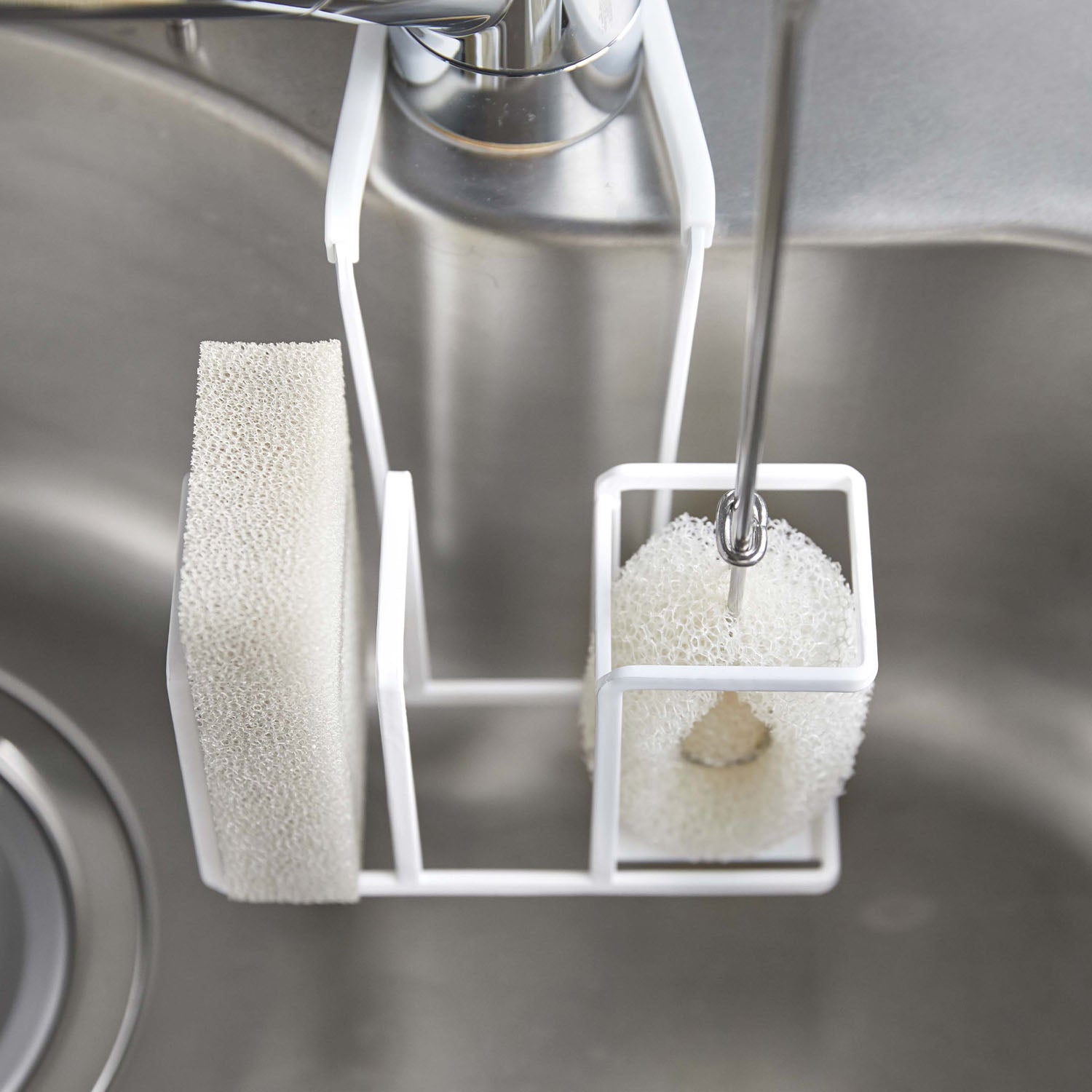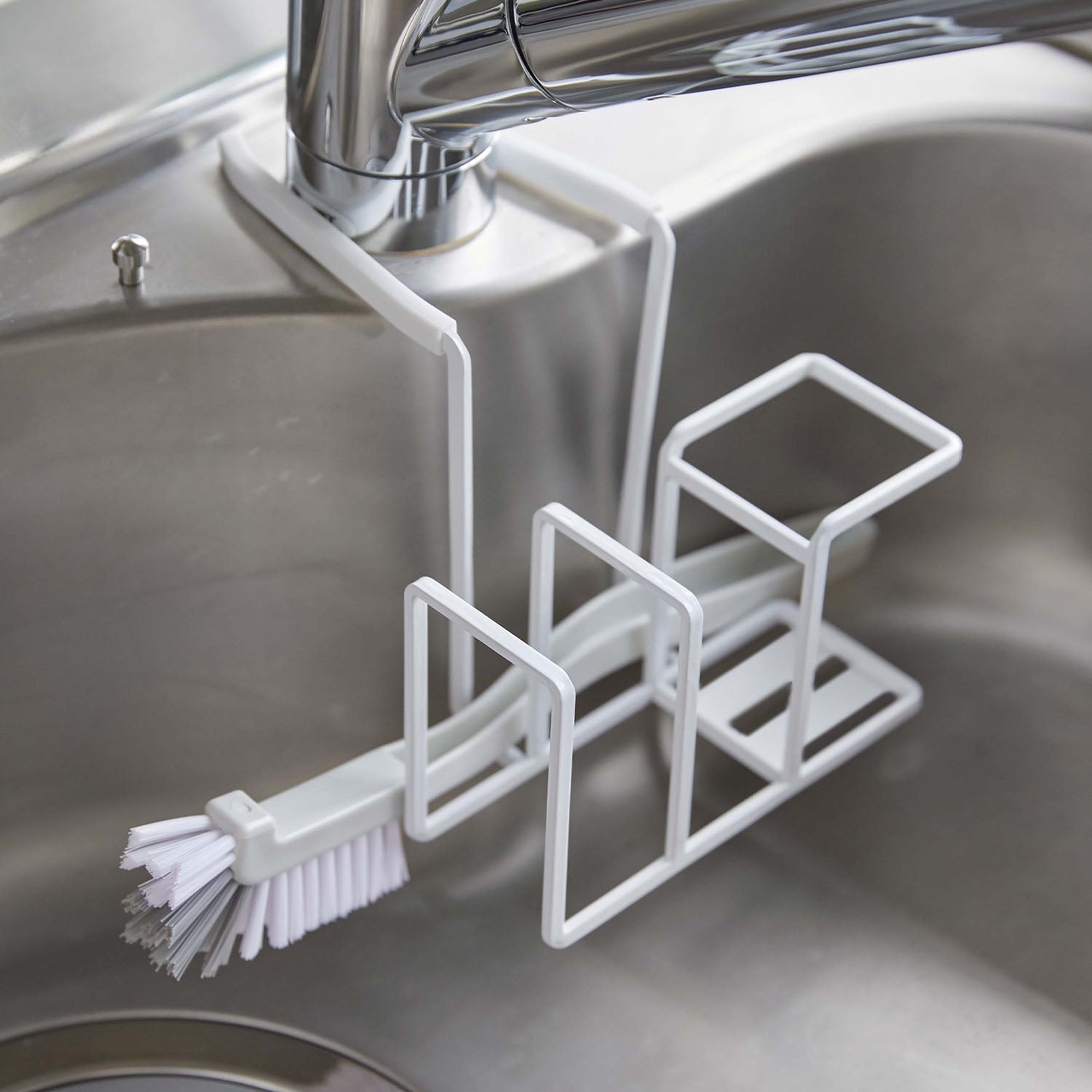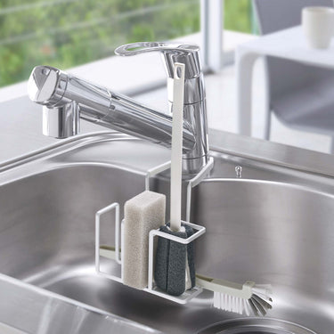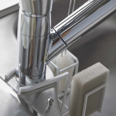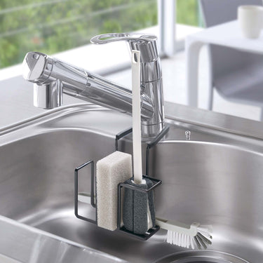 A sponge and brush holder that neatly hangs on your tap for tidy storage.