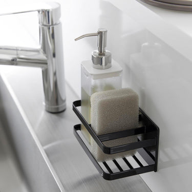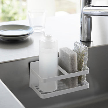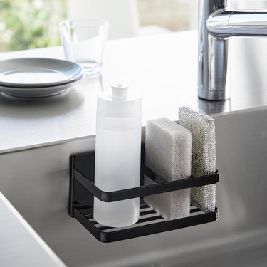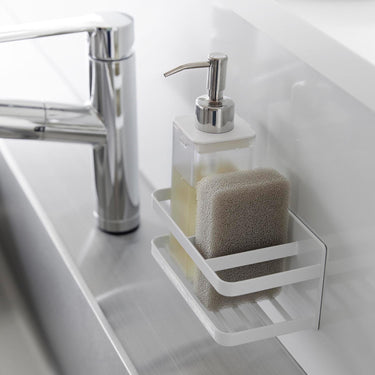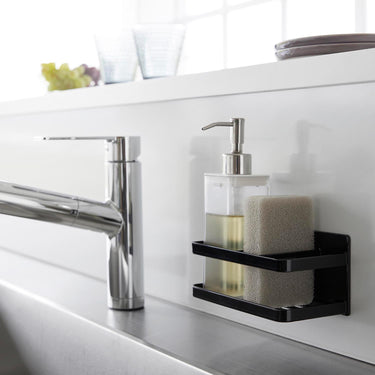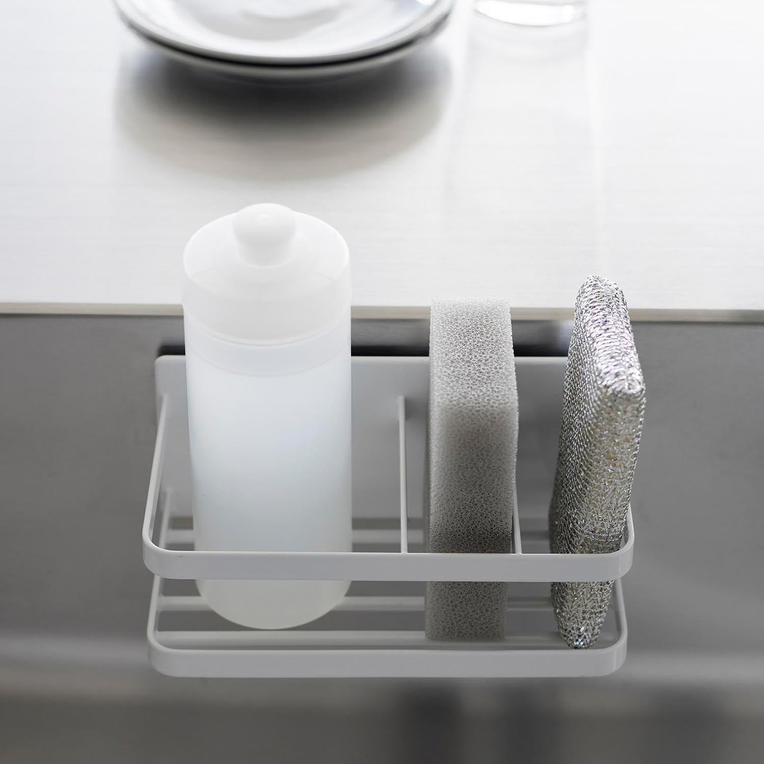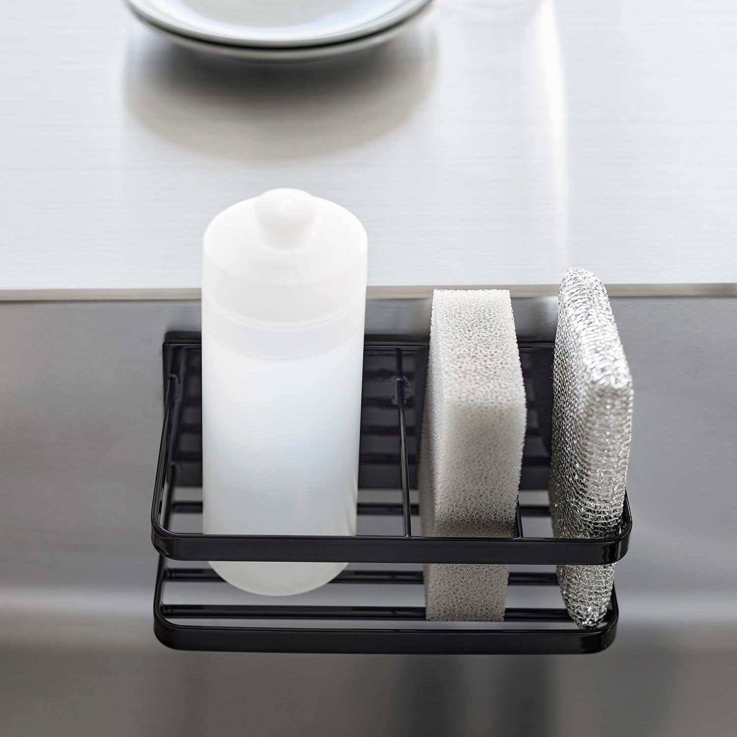 A sponge and bottle rack that can be easily attached to any magnetic surface.