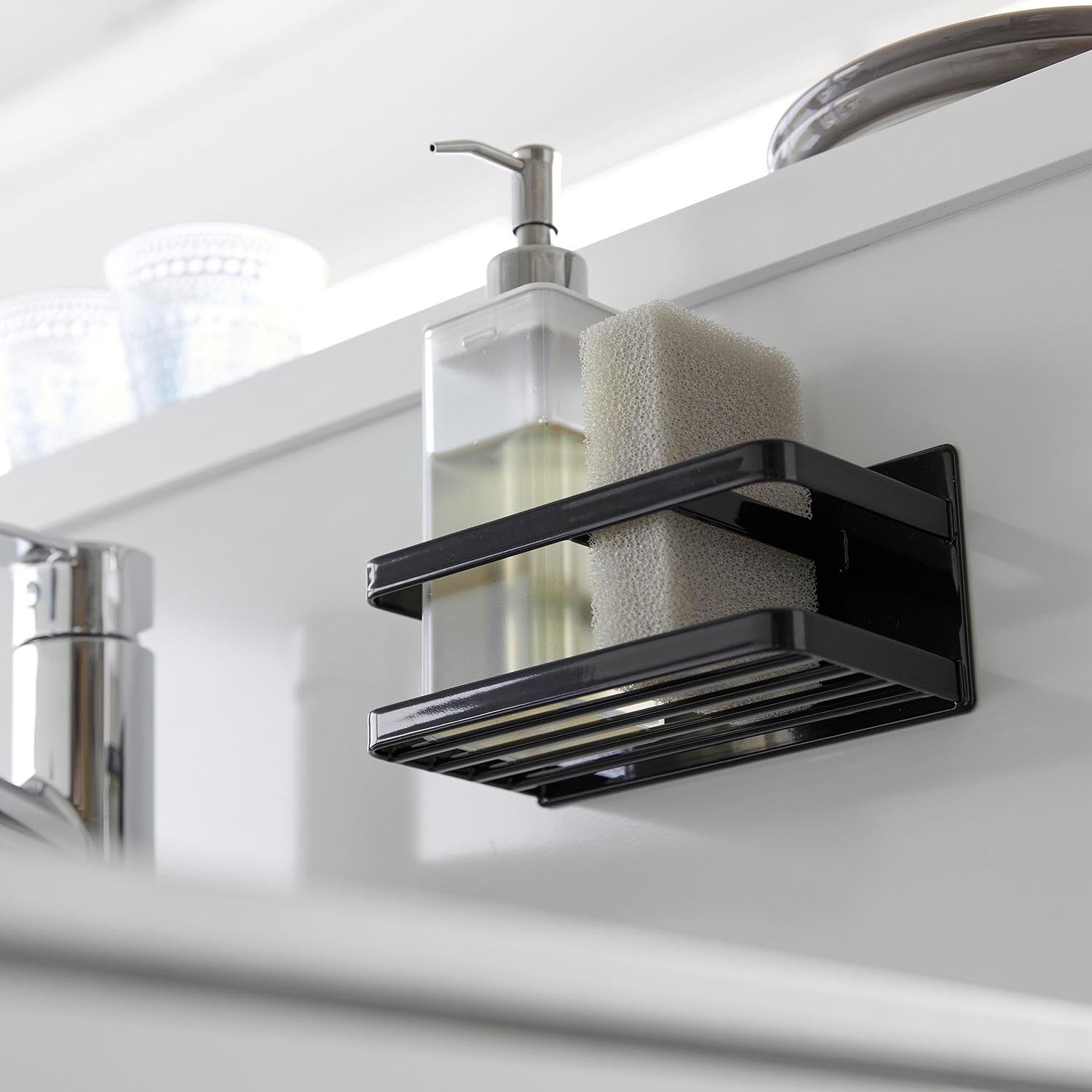 A sponge and bottle rack that can be easily attached to any magnetised surface.