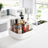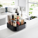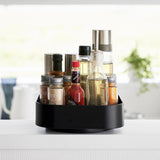 A storage rack that rotates 360° for easy access, and has raised edges to prevent items from falling over.