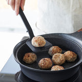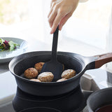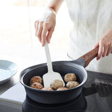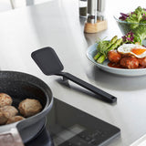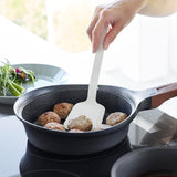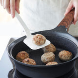 This is a compact-sized, heat-resistant silicone spatula. Its silicone coating ensures that it won't scratch your frying pans or pots. The flexible blade allows you to flip your food cleanly, and its non-slip nature ensures a firm grip. When placed down, the tip stays elevated, keeping it clean and solving the problem of where to put it while cooking. It's also dishwasher-safe, making it easy to clean.