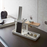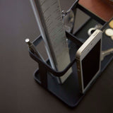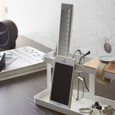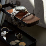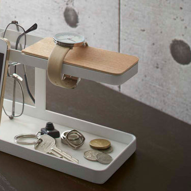 This desk bar allows you to neatly store items such as watches, accessories, and smartphones all together. With a combination of a tray and bar, it can also accommodate taller items like remotes and glasses. The bar is perfect for hanging watches and bracelets. It can hold two large men's watches or three smaller women's watches. Its sleek design that doesn't interfere with your interior decor is also a key feature.