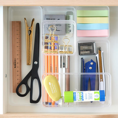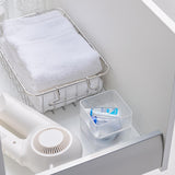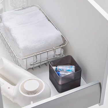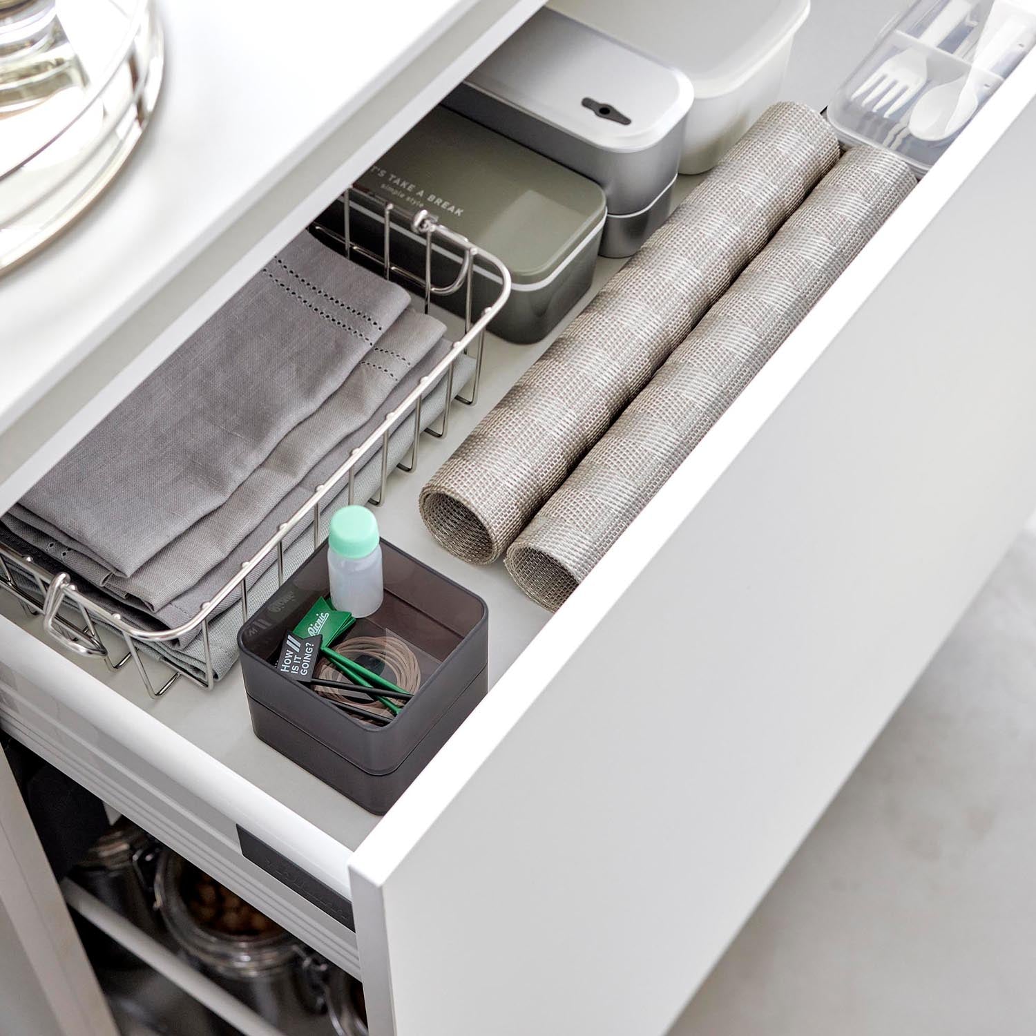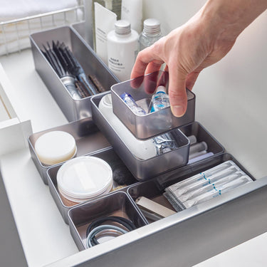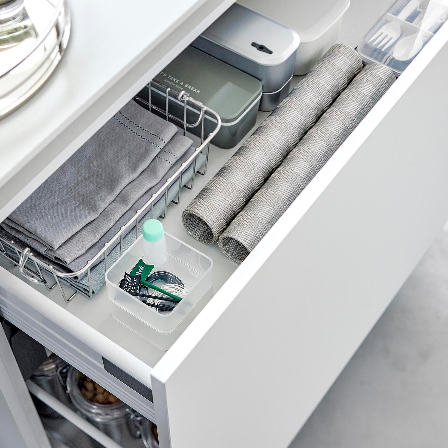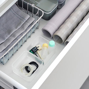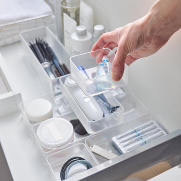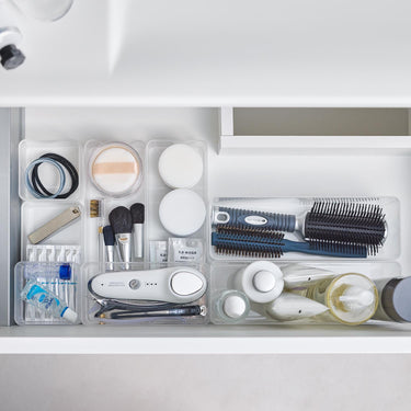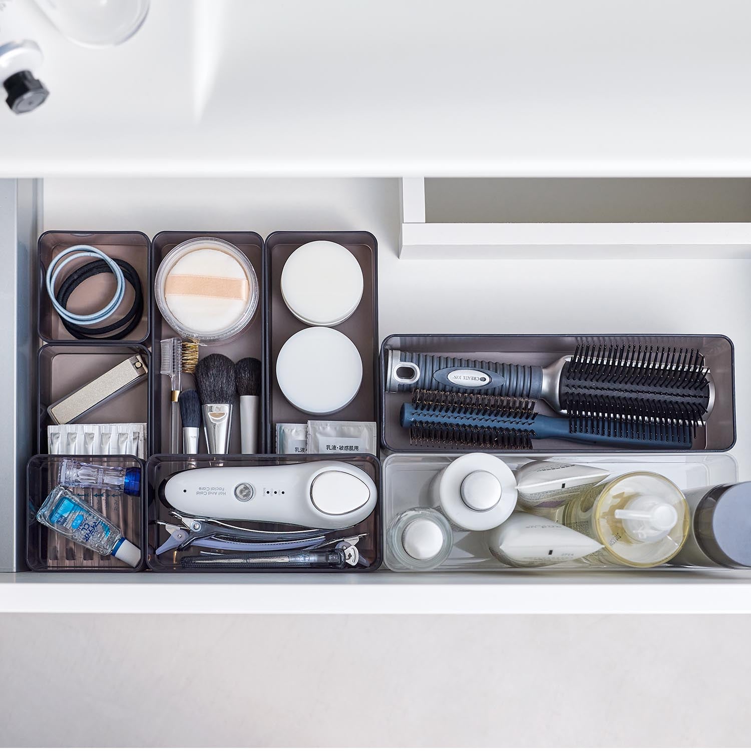 This small-sized storage case is perfect for organising small items. You can also combine it with our separately sold medium, large, and deep-sized cases. Each size can be neatly stacked, allowing for various combinations depending on what you want to store. You can even slide the medium, large, and deep-sized cases on top. The bottom is clear, so items in the lower layer won't be hidden when stacked. It's ideal for storing cutlery in the kitchen, cosmetics in the bathroom, and stationery on your desk.