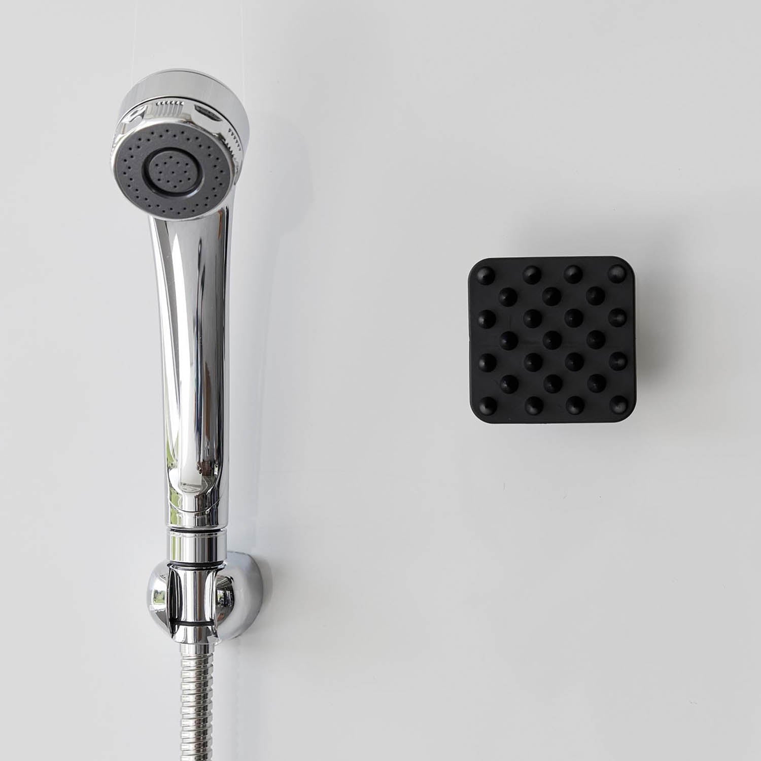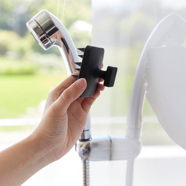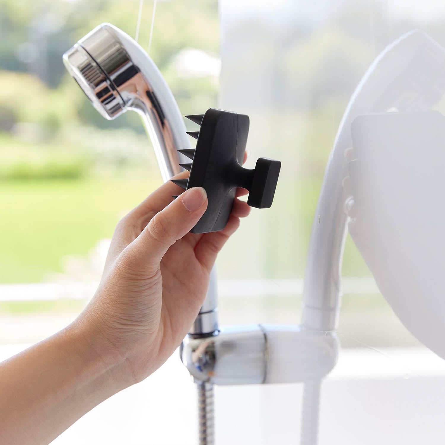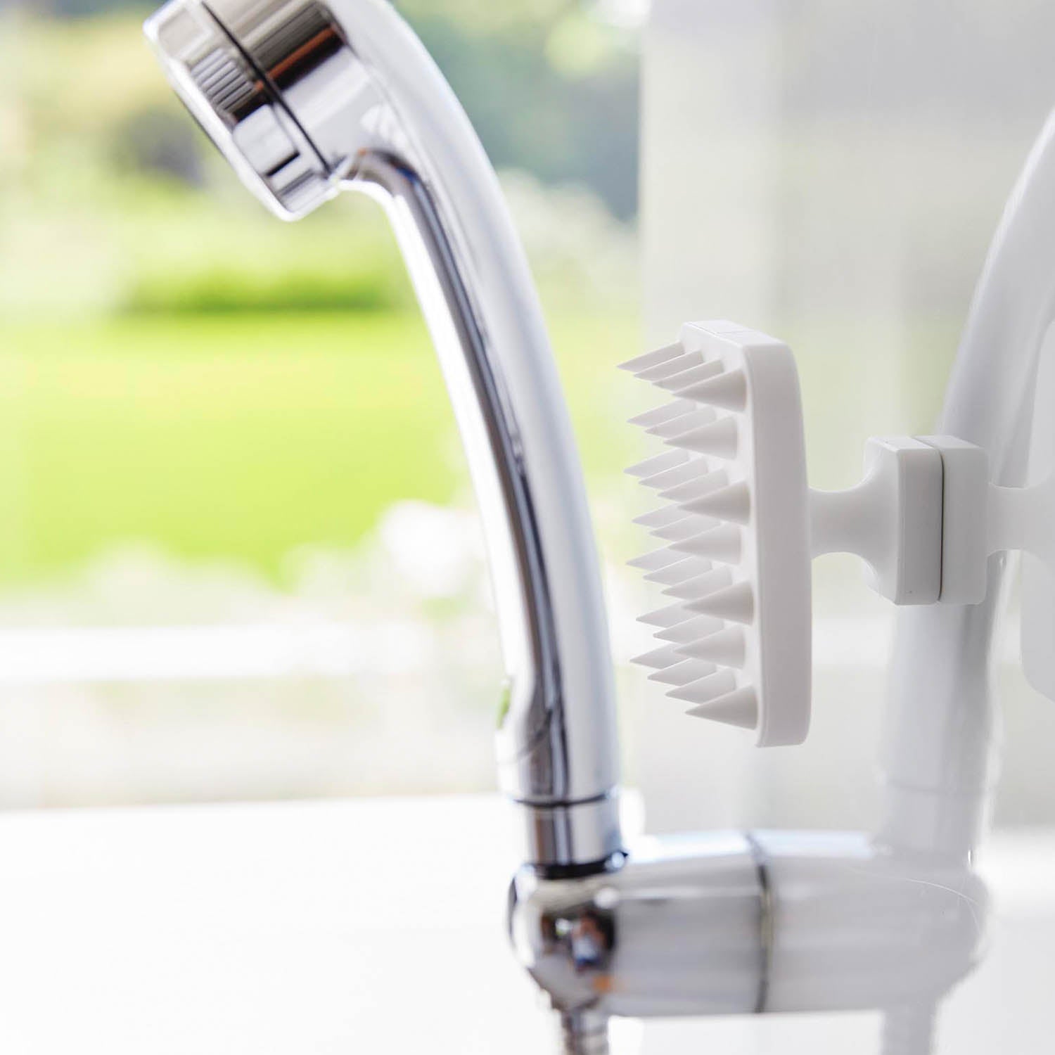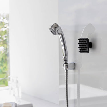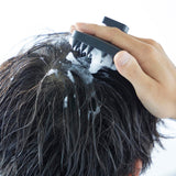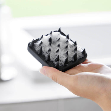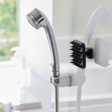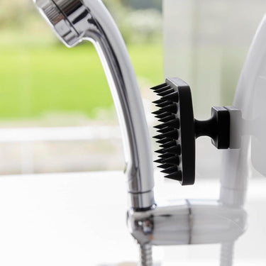 A soft scalp massage brush that can be easily stored on the bathroom wall with a magnet.
