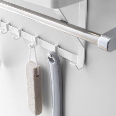 This rack is perfect for storing those pesky bath items that never seem to have a home. It's also great for storing laundry bottles, washing accessories, and bath cleaning supplies. The tray has grooves for good water drainage, and it comes with five detachable hooks.