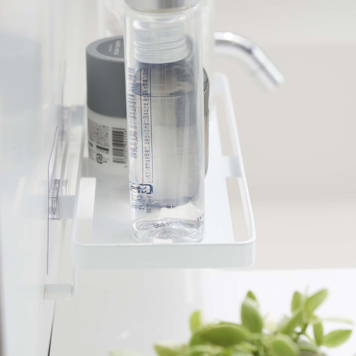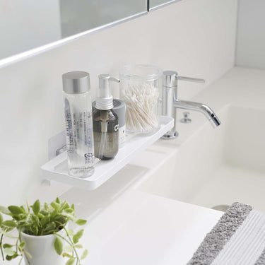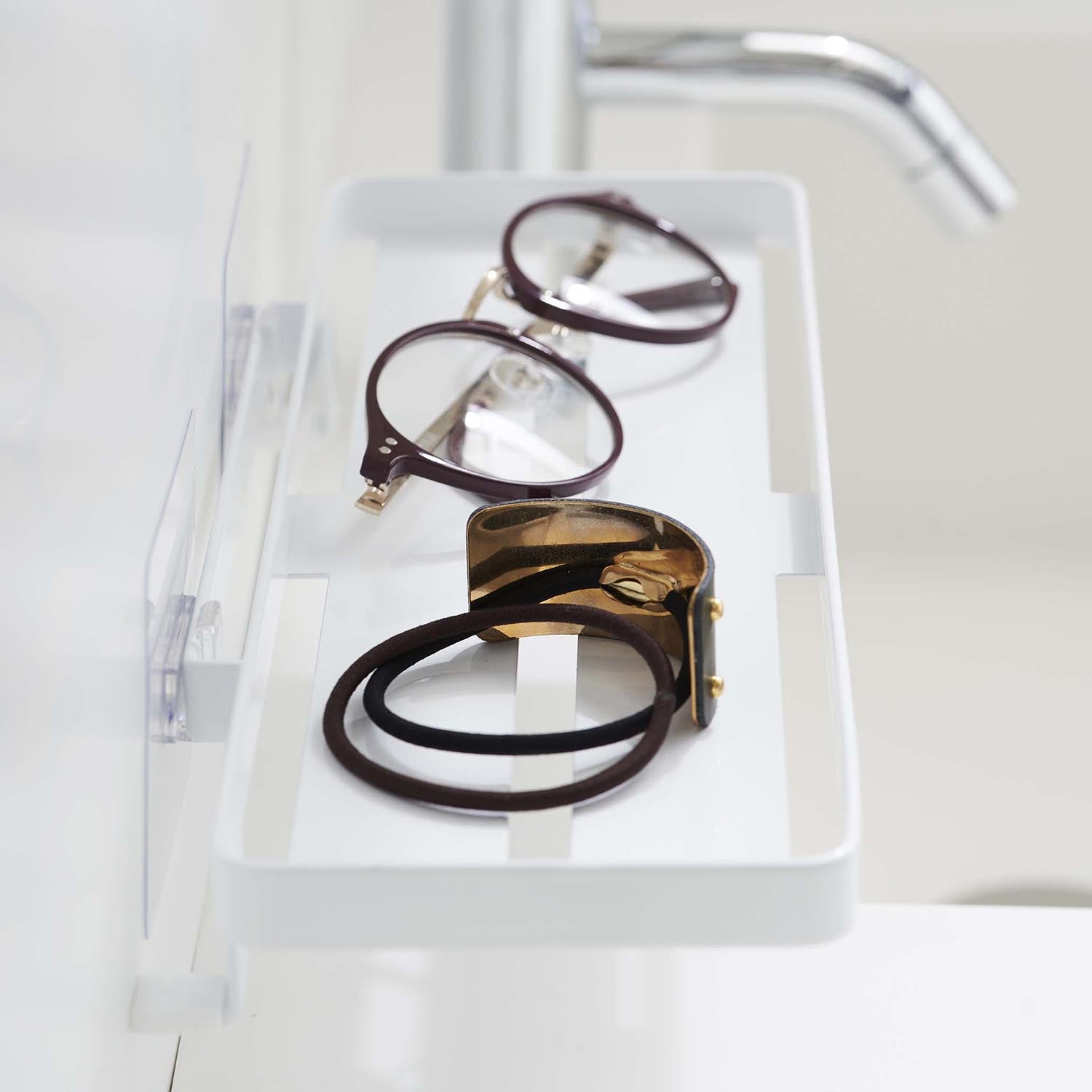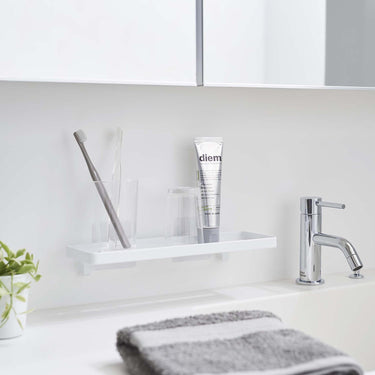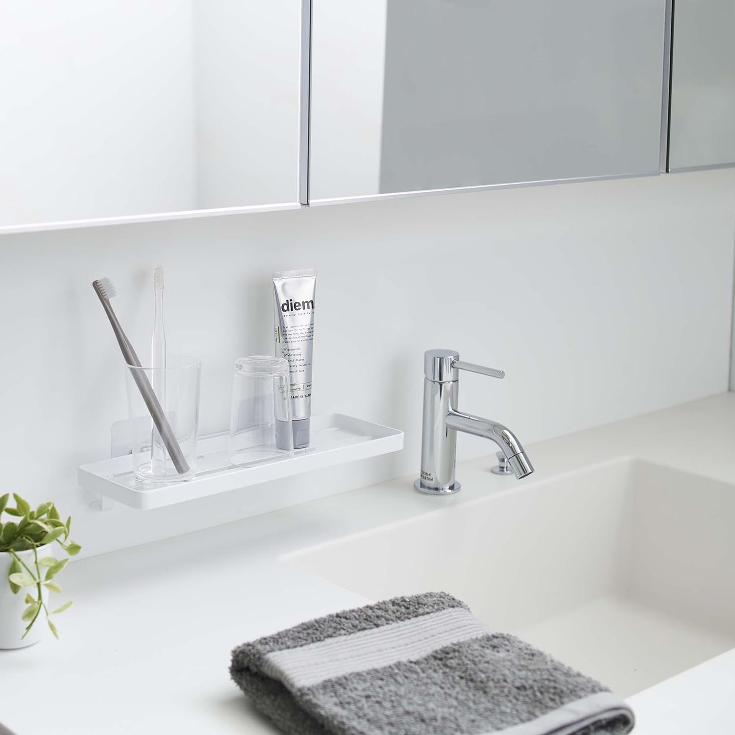 Its wide size allows for the storage of items such as toothbrushes, toothpaste, and tumblers all in one place. The raised storage design makes cleaning a breeze. It can also store makeup tools such as toner, cotton swabs, and cotton pads, as well as hair styling products. The tray is wide enough to be used as a temporary place for glasses, hair ties, and hairpins. You can rest assured as it can be securely fixed with the peelable film hook.