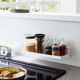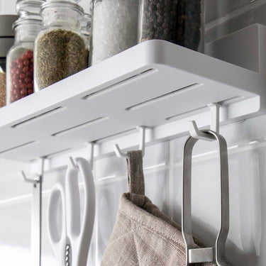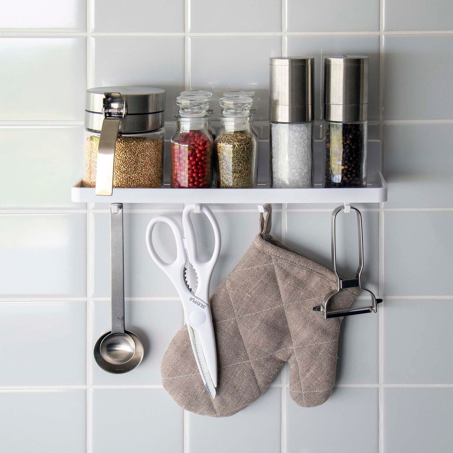 This tray can be easily attached to any glossy wall surface using film hooks. It can also be attached to tiles or glass doors. It's perfect for storing kitchen tools and condiment bottles, and with its drainage holes, it's also ideal for drying items like baby bottles, glasses, and mugs. If you attach the included hooks to the bottom, you can hang small items like kitchen tools for storage. As it floats, it's also hygienic.