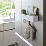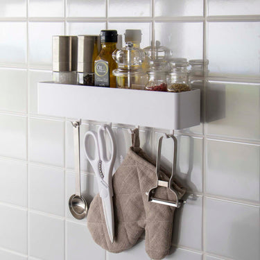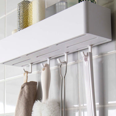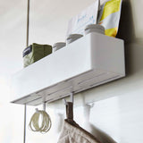 This tray can be easily attached to glossy wall surfaces using film hooks. It can also be attached to tiles or glass doors. It's convenient for storing various items such as sponges, bottles, kitchen tools, and condiments. By attaching the included hooks to the bottom, you can hang small items like kitchen tools for storage. As it is suspended, it is hygienic.