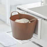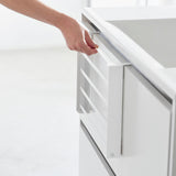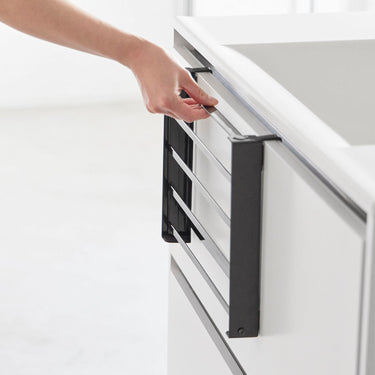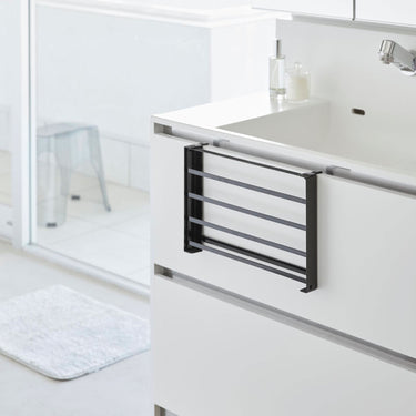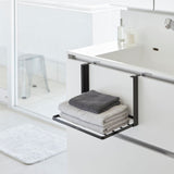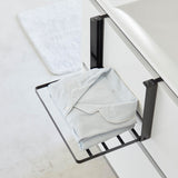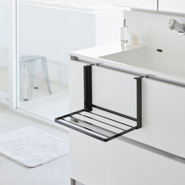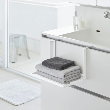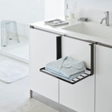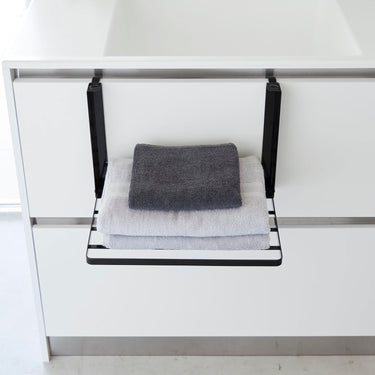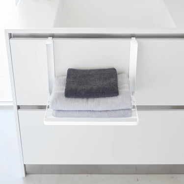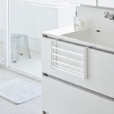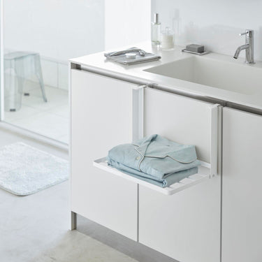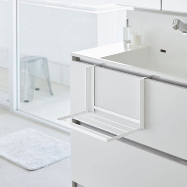 This shelf is easy to install, simply by hooking it onto the door of your vanity unit. It's handy for temporarily placing towels and clothes after bathing. When not in use, it folds up into a slim design with a depth of 4cm, making it perfect for saving space. It's also useful for temporarily placing laundry baskets. It fits drawers and doors with a thickness of 1.5 to 2cm.