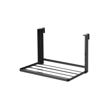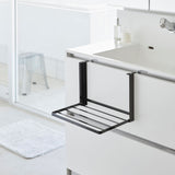 A space-saving foldable shelf that's easy to install by simply hooking it onto the bathroom cabinet door.