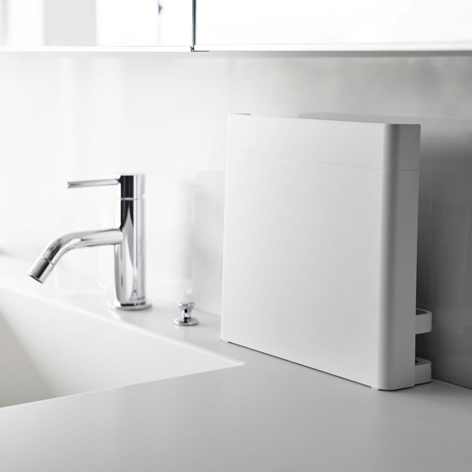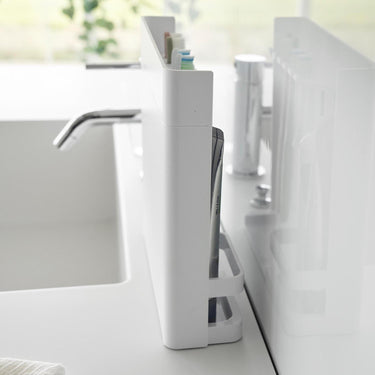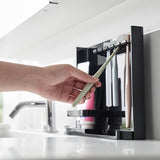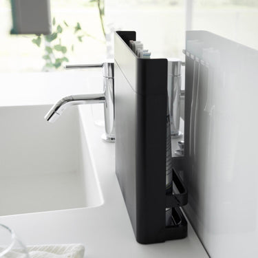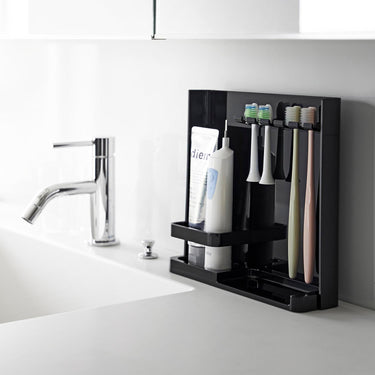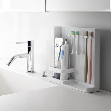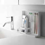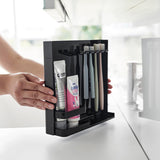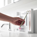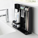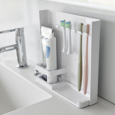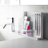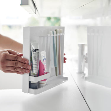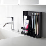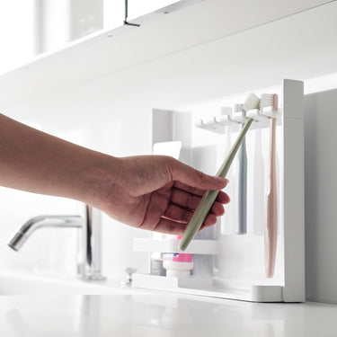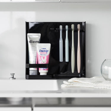 With its simple design, this toothbrush and toothpaste tube stand keeps everything neat and tidy. It can hold up to five toothbrushes and two tubes of toothpaste. Storing your toothbrush is as simple as hanging it up. If you need to hide them when guests come over, just flip it over for a quick concealment. It's convenient to move around as a unit. It can also store electric toothbrushes and replacement brushes. The tray can be removed from the main body for easy cleaning.