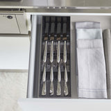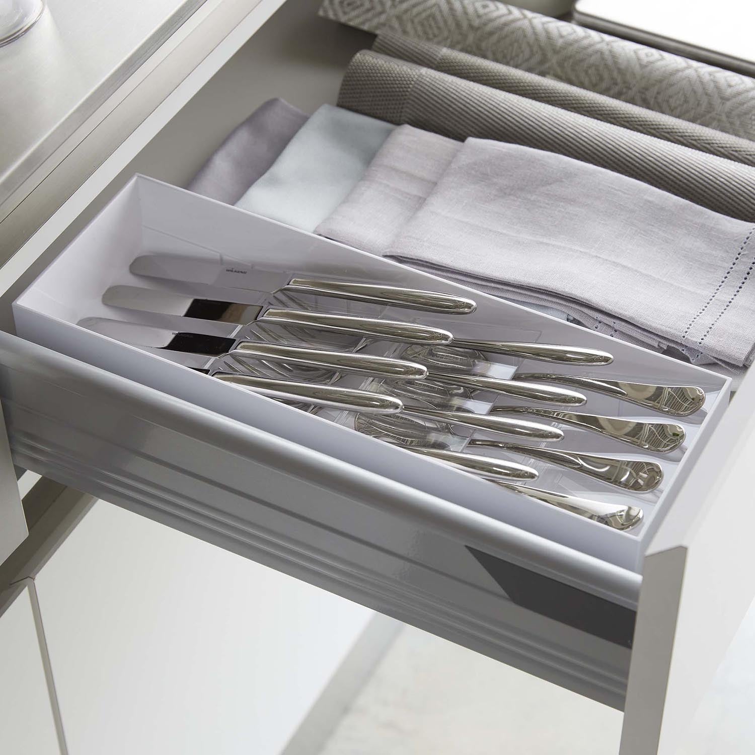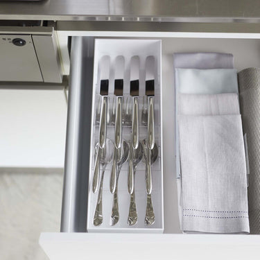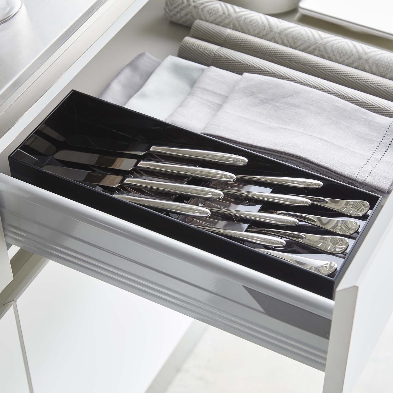This cutlery case allows you to store your cutlery in a stacked manner thanks to its diagonal dividers, making for more efficient use of your storage space. The dividers can be adjusted every 2cm to fit the size of your cutlery. They are transparent so you can easily see the cutlery stored underneath. The case also includes a non-slip feature to prevent slipping when opening and closing the drawer.