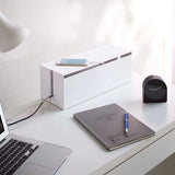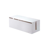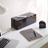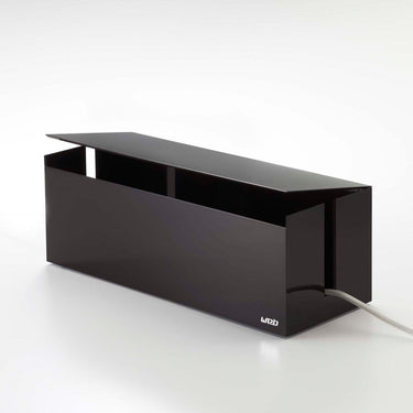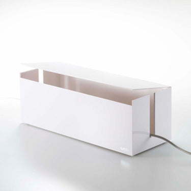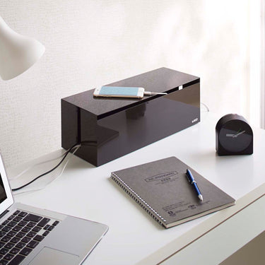 A high-quality cable box that neatly stores unsightly cable taps. It has a structure that releases internal heat through ventilation holes on the front and sides. The lid has a wiring port on the front, making it easy to charge digital devices on top. The lid can be easily and smoothly opened and closed with one hand from the wiring port on the front.