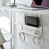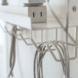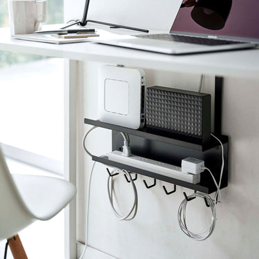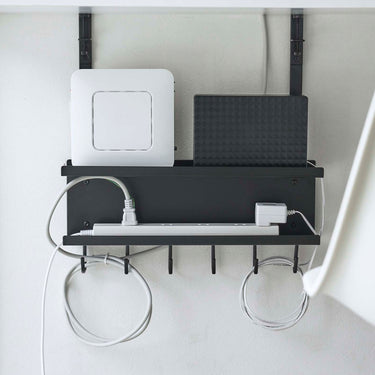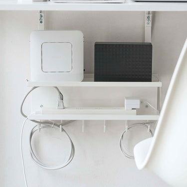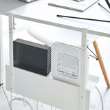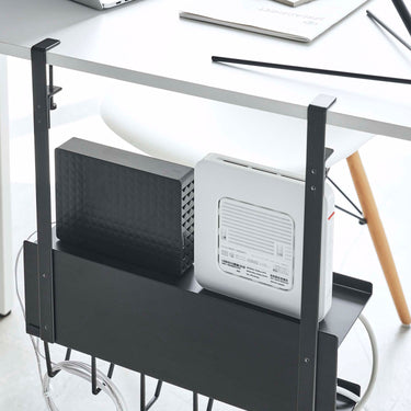 A storage rack that attaches to your desk, elevating and storing cables and routers.