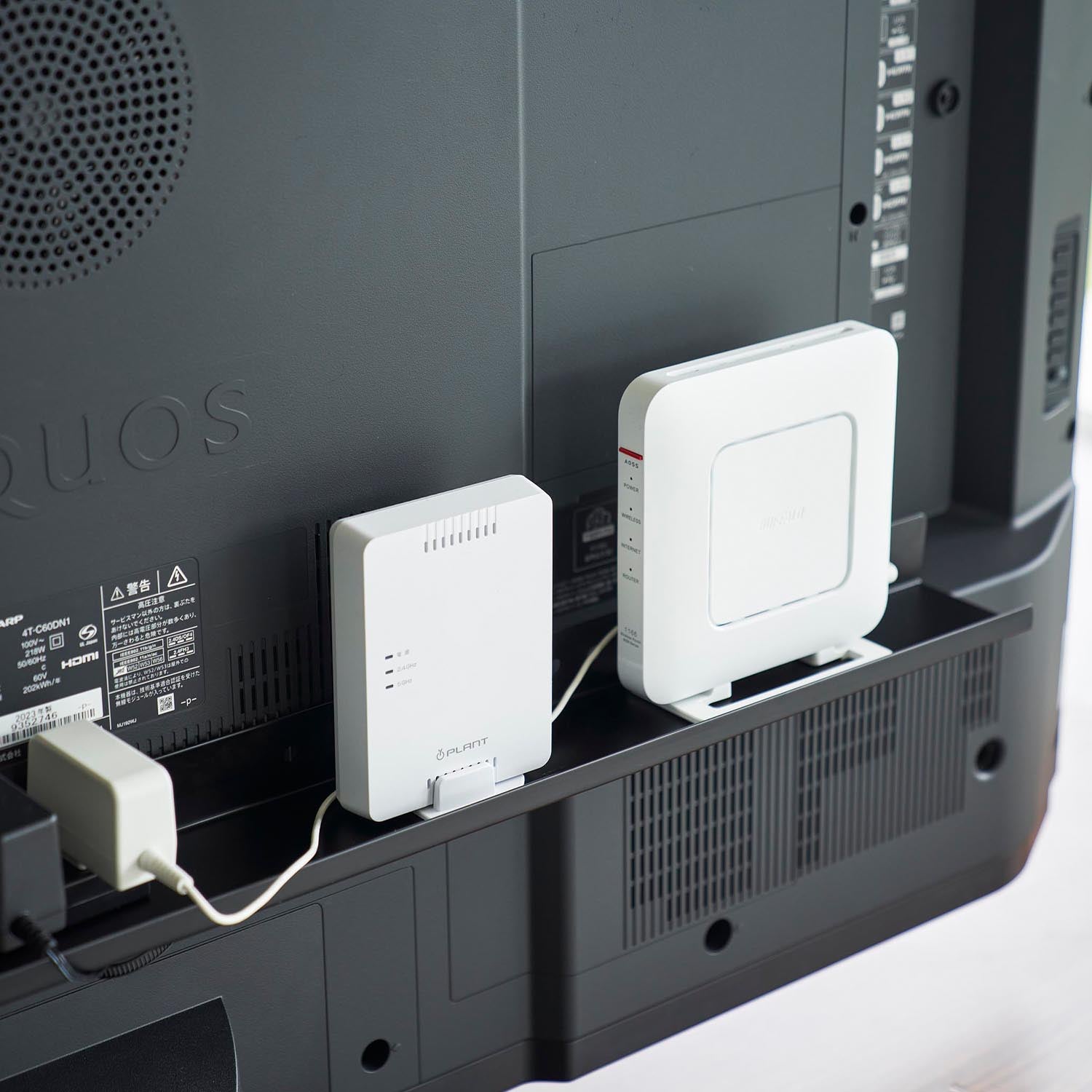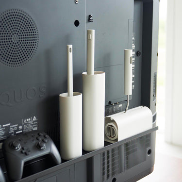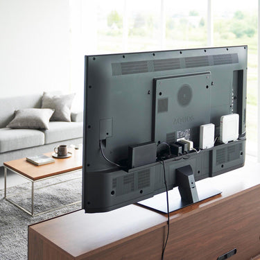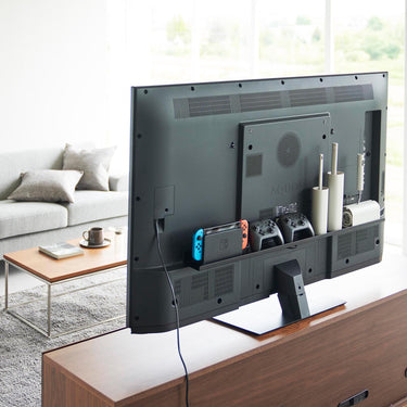 Easily store items such as routers, external HDDs, and power strips neatly behind your TV. The space behind your TV can also be used to discreetly store frequently used cleaning supplies or game controllers. Installation is simple, just screw it into the holes at the back of your TV. Compatible with VESA standards.