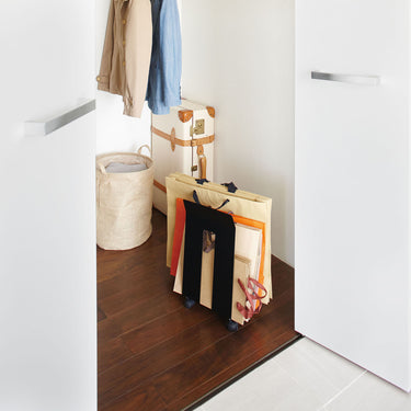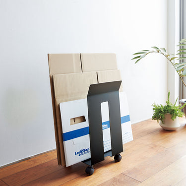 Easily store the excess of cardboard that quickly piles up from online shopping in this slim storage unit. With its attached casters, moving it around is a breeze. It can also be used for temporary storage of paper bags.