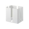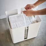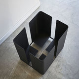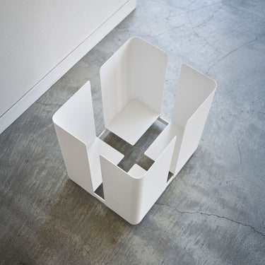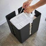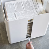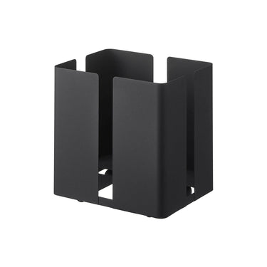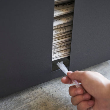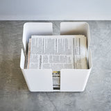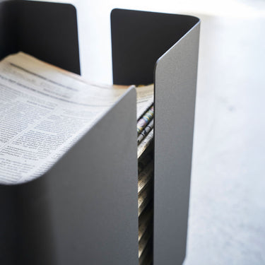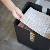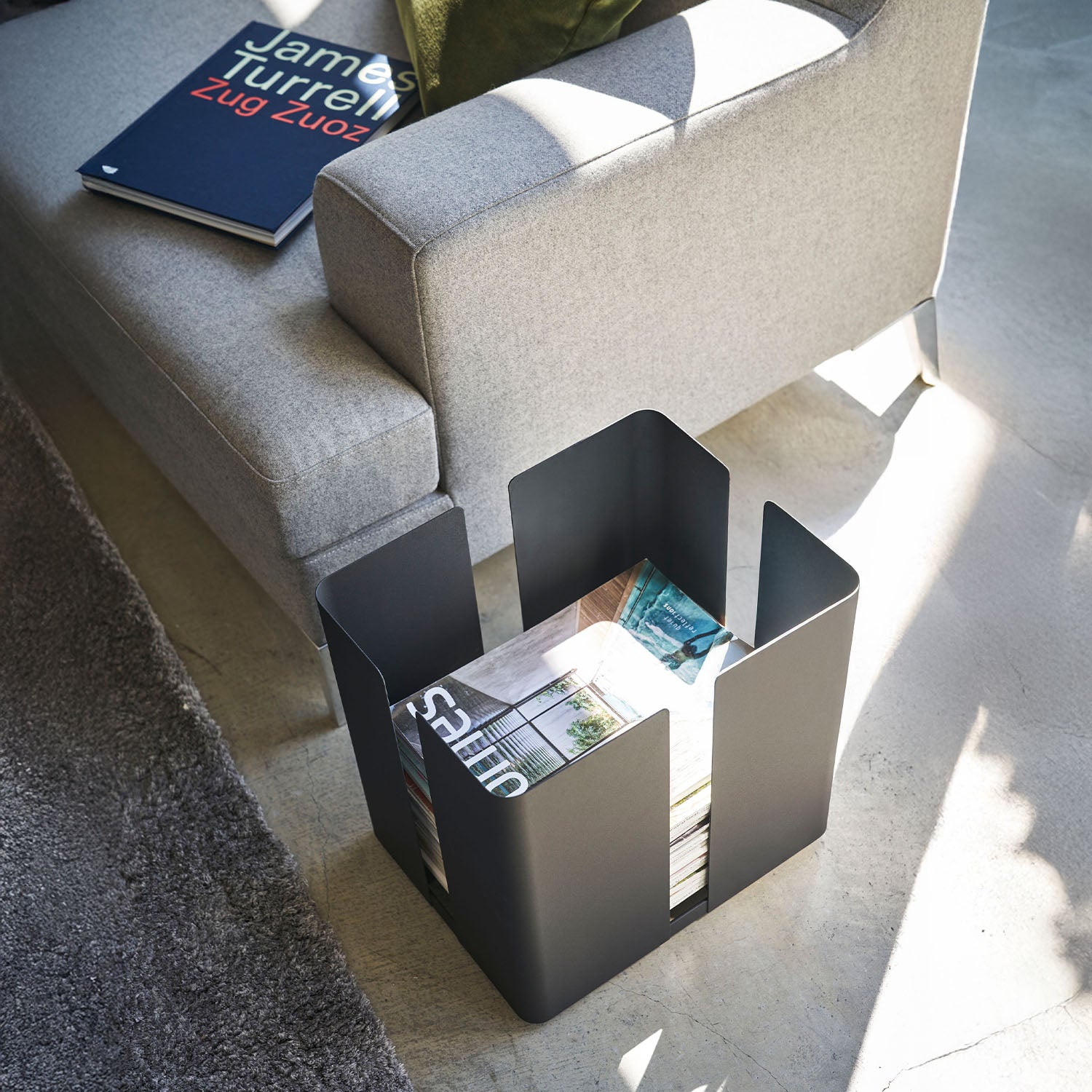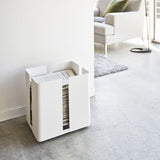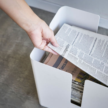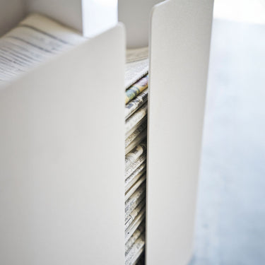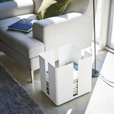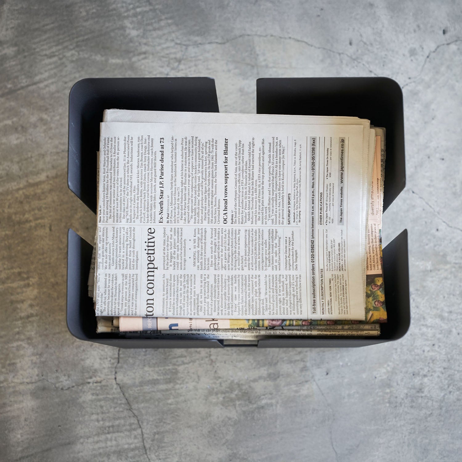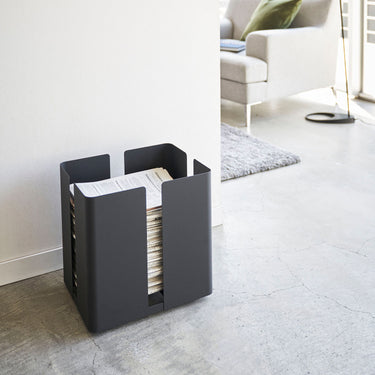 The design includes a wall, making it difficult to see magazines, newspapers, and paper bags from the side. The structure allows for strings to be threaded from the bottom for easy bundling. The casters are subtly hidden, contributing to its stylish design.