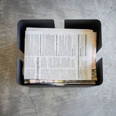 The design includes a wall, making it difficult to see magazines, newspapers, and paper bags from the side.