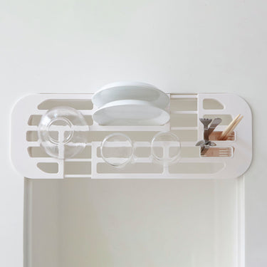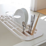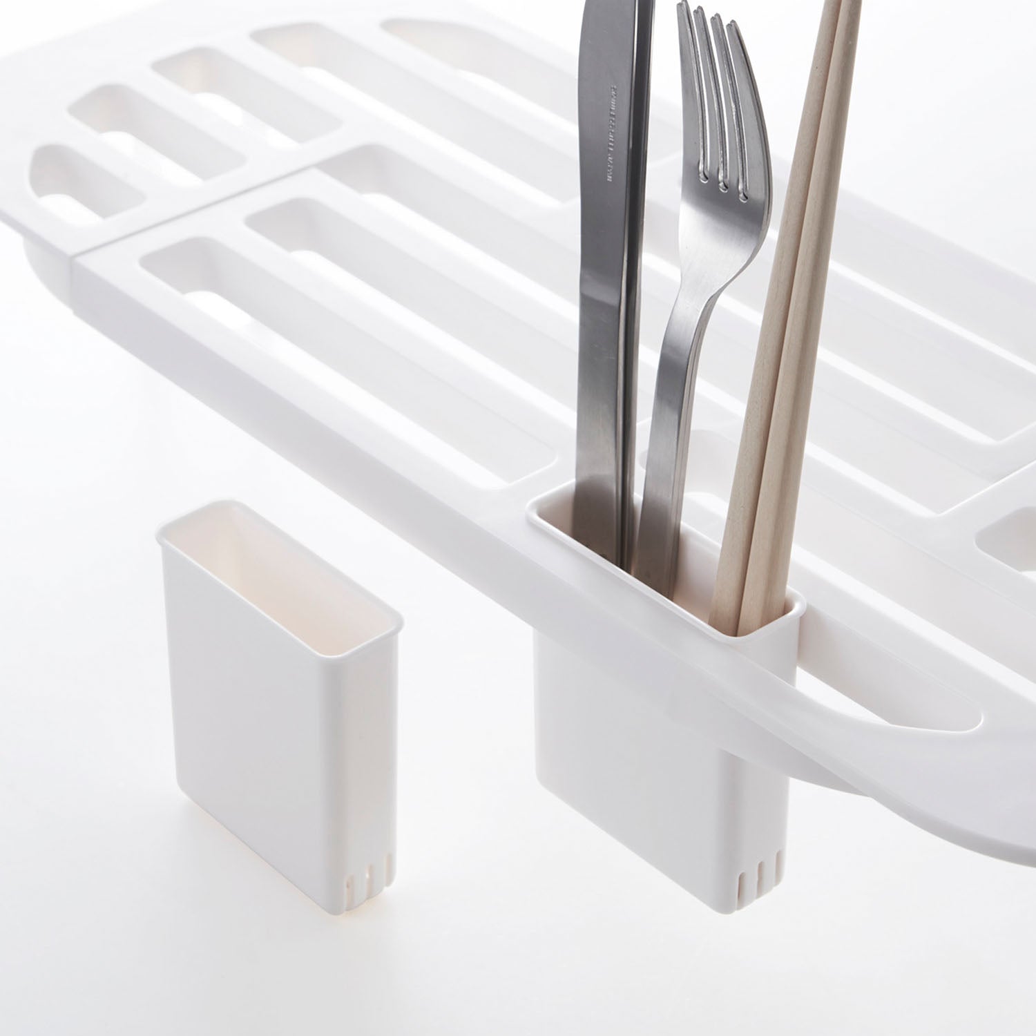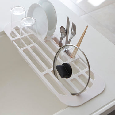 A handy dish drainer rack that can extend from 38cm to 55cm to fit your sink. It features slits for standing dishes and comes with two versatile cutlery pockets that can be attached wherever you like. It can also be used as an extension shelf to expand your cooking space. Its curved shape fits perfectly in the corner of the sink, and its non-slip design makes it less likely to slip or damage your sink.