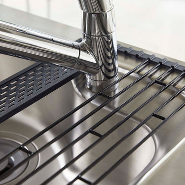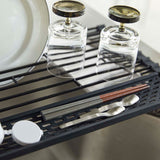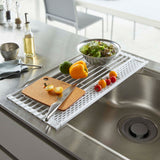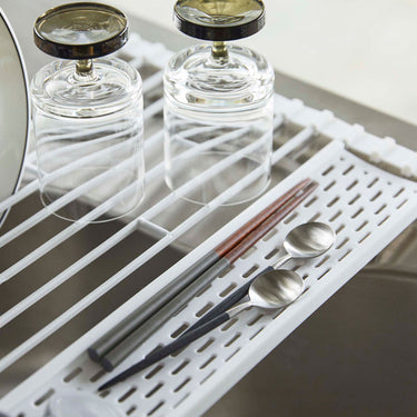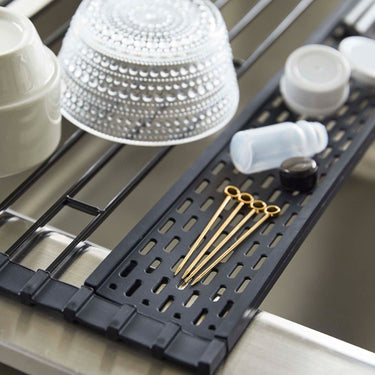Comes with a silicone tray for small items! With the silicone tray, you can drain even small items. When not in use, you can roll it up for compact storage. Make effective use of your sink space! It can also be used as an extension of your kitchen counter. Fold it according to what you're placing on it for space-saving use. As a temporary place for pots. The transfer work of pots and other items that tend to take up space can be done smoothly. The wire is removable, so you can use it avoiding the tap. It comes with a partition, so you can stand dishes up for draining.