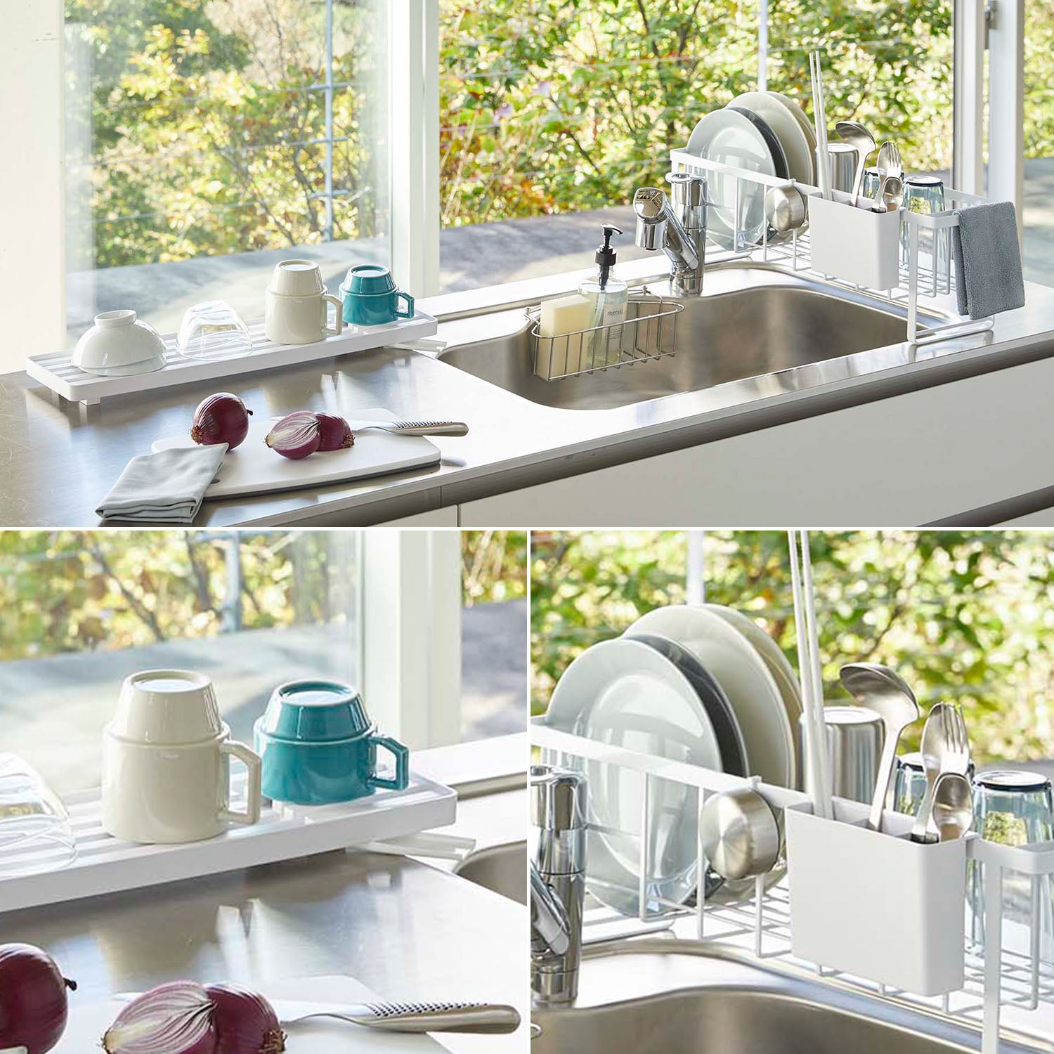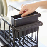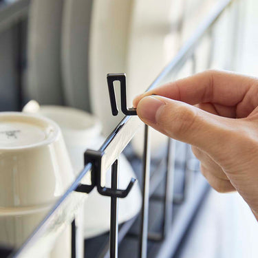 A slim-sized basket and dish drainer that can be placed anywhere. Not only can the basket and tray be combined, but they can also be used separately in a 2-way design. The wire basket can also be used by placing it over the sink. The included cutlery pocket can be attached wherever you like, and can even be set inside the basket. The included hooks can be attached wherever you prefer. The tray comes with a movable drain that can directly drain water into the sink. With a built-in plug, it can be used even in places where drainage is not possible.