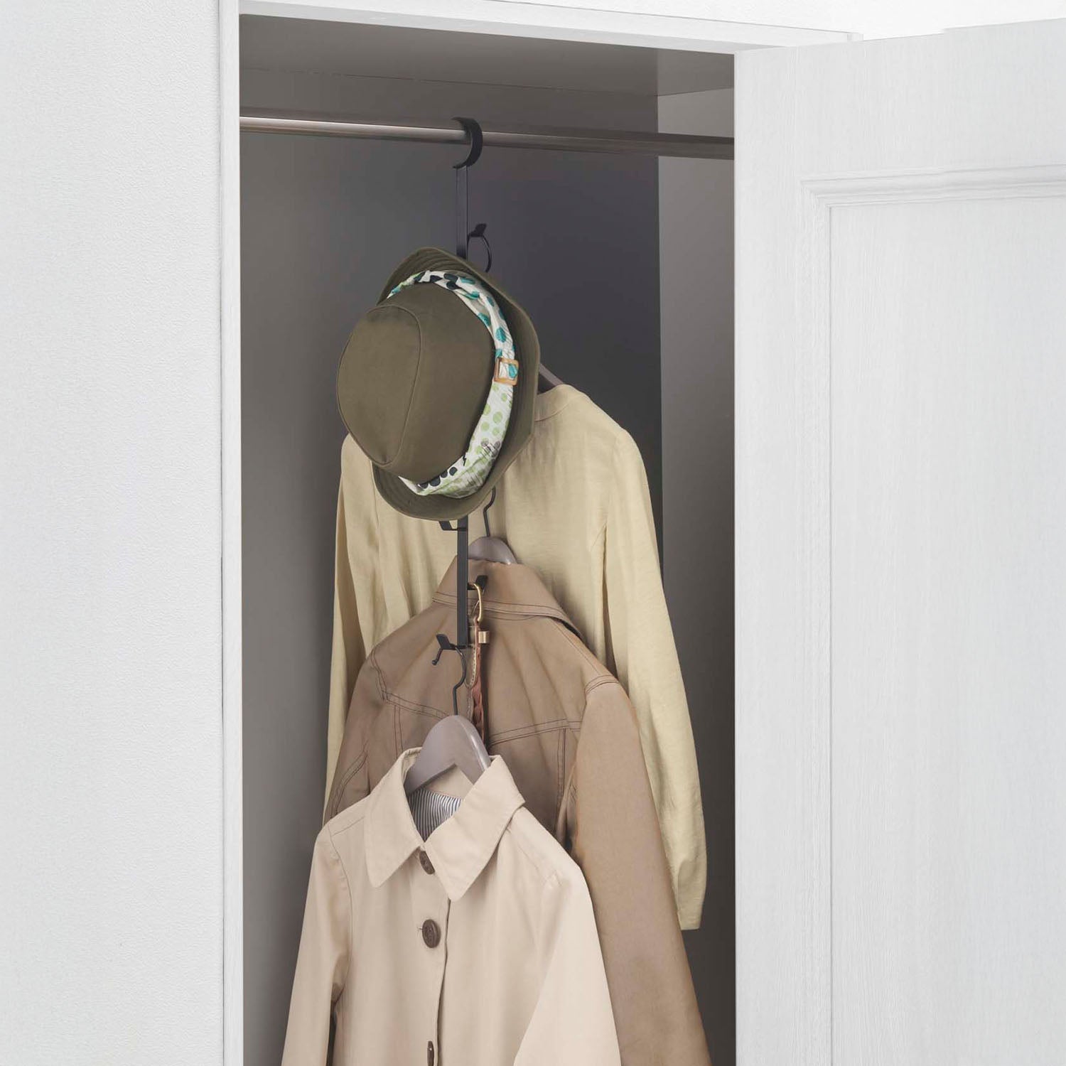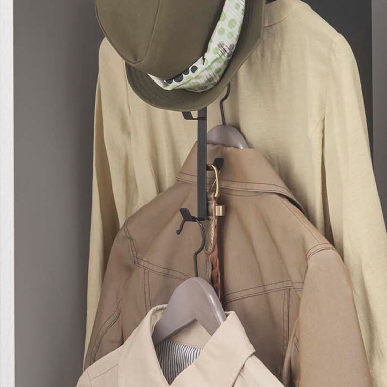 A slim, space-saving hanger. Equipped with up to 8 hooks, it allows for the tidy storage of bags, hats and other items that tend to clutter up your closet.