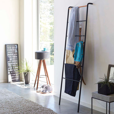This leaning ladder hanger is handy for storing trousers and scarves, as well as for temporarily hanging clothes. You can also store small items like belts by using S-hooks. It's also useful for temporarily hanging towels and clothes, and its slim leaning design means it can fit anywhere.
