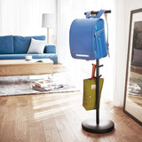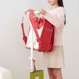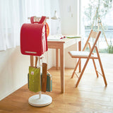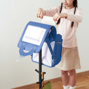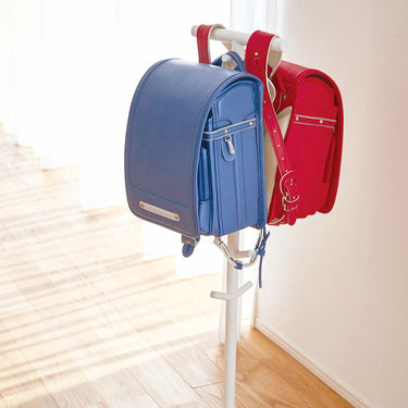 This stand provides a solution for storing bulky school bags. It allows you to hang the bag and even open it while it's still hanging. You can also hang two bags, front and back. With additional hooks, it's possible to store items like shoe bags alongside the school bag. Its compact size means it can fit in various rooms such as the entrance, living room, or your child's room, depending on your lifestyle. This versatile stand can be used for more than just school bags; it's also suitable for storing other bags and uniforms.