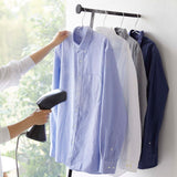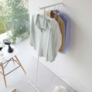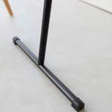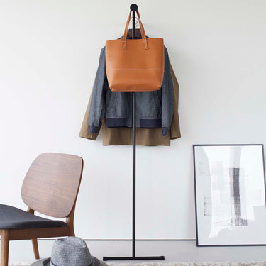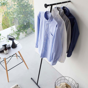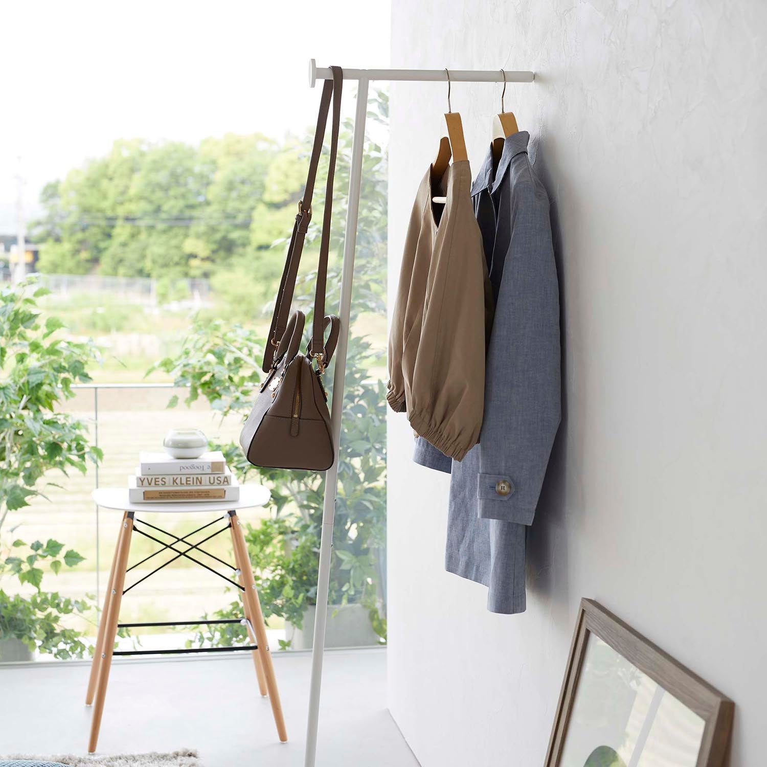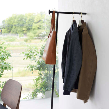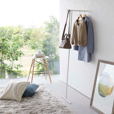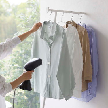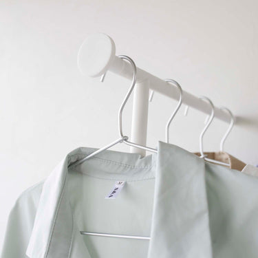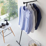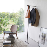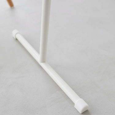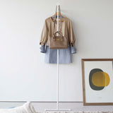 This compact coat hanger, measuring 38.5cm in width and 47cm in depth, doesn't take up much space. It's easy to set up - simply lean it against a wall. The hooks at the end are made of soft silicone, making them perfect for storing bags and hats. You can also easily hang a clothes steamer on the hanger. The base is equipped with a silicone cushion, preventing it from slipping.