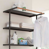 With three tiers of shelves and a hanger bar accented with wood grain, you can store plenty of items.