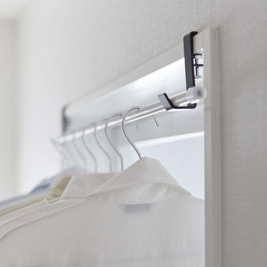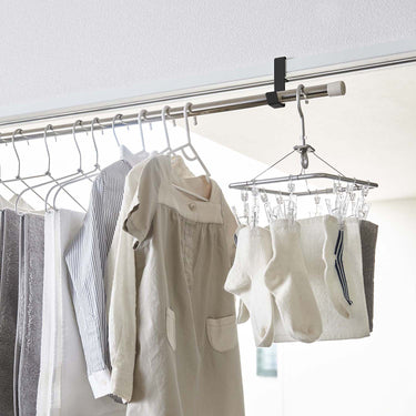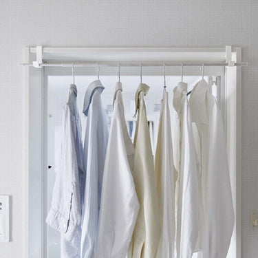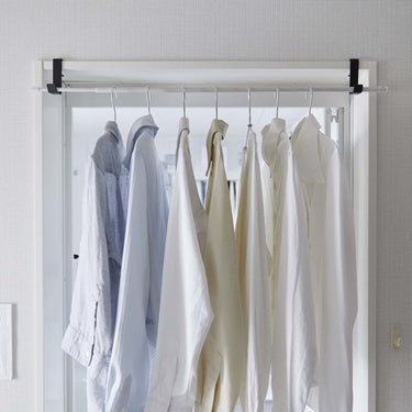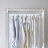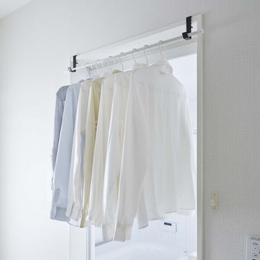 Easily installable on doorframes and window frames in rooms or in front of the bathroom. It can also be used as a place to hang laundry or for storage. Compatible with wooden doorframes, sliding door frames, window frames, desks, and shelves. Prevents falling by inserting a pin into the top of the frame. It can be securely fixed to the frame with an adjustment screw.