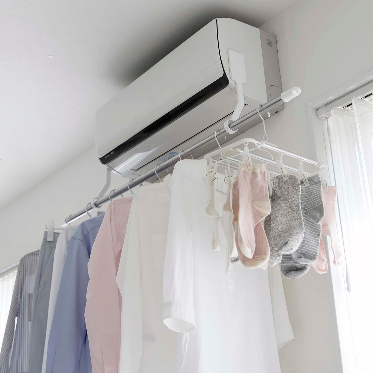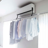 An indoor clothes drying pole holder that efficiently dries your laundry by directing air conditioner wind directly onto it.
