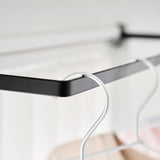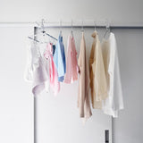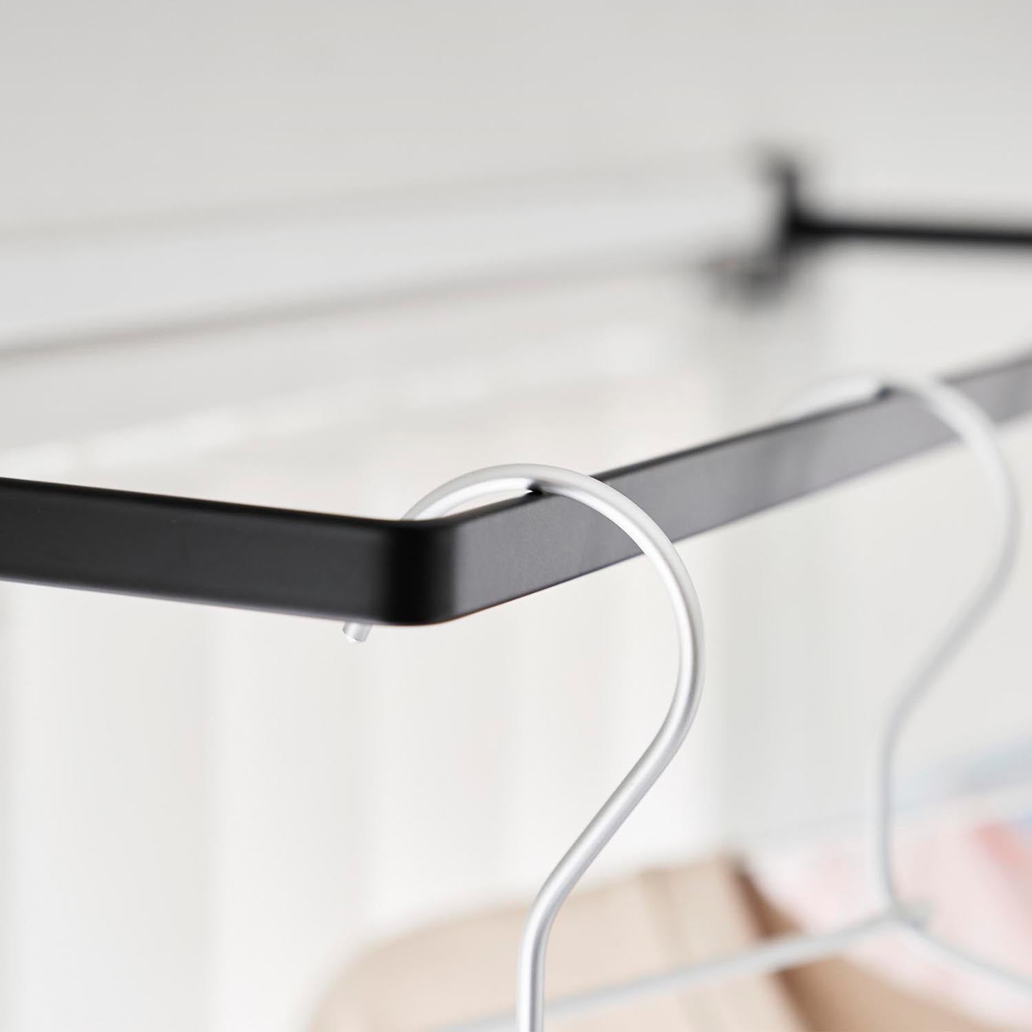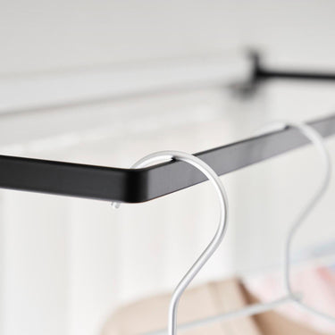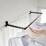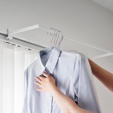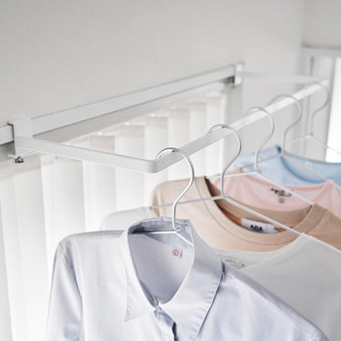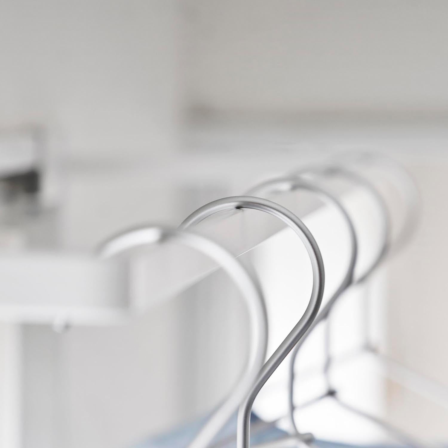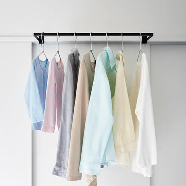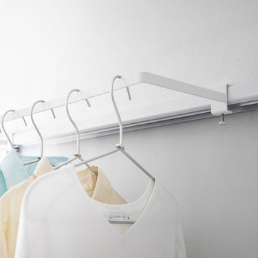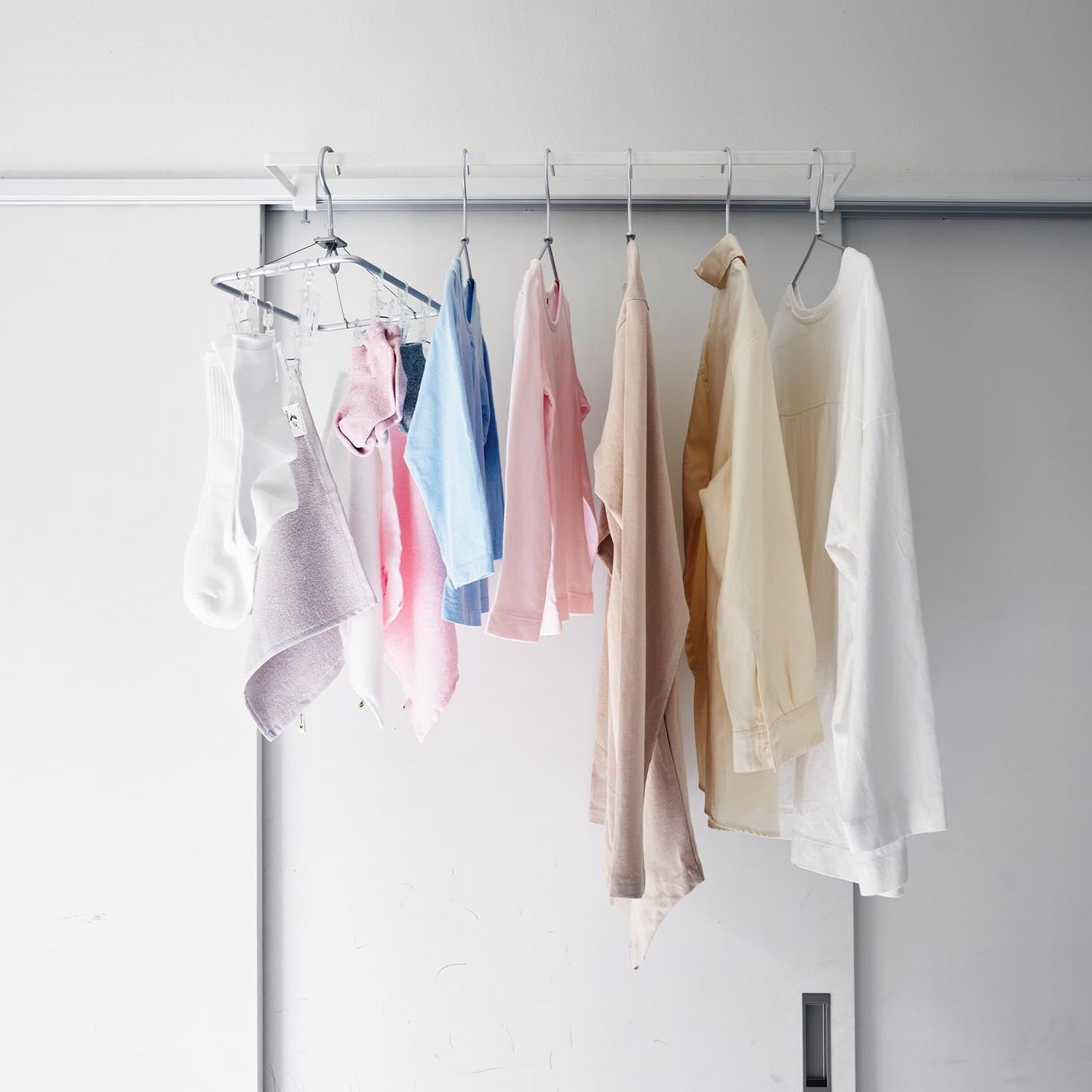 Easily attachable to doorframes, window frames, and more. This indoor drying hanger allows you to dry your clothes even with sliding doors or curtains closed. It's designed to avoid contact with curtains or shades, creating a space with good airflow. A convenient solution for securing additional drying space. If installed in the laundry room, the process of washing and drying can be completed in one place. Gather your laundry quickly and take it in all at once. Prevents falling by pinning to the top of the frame. Comes with an included hex wrench, allowing you to securely fasten it to the frame using the adjustment screw.