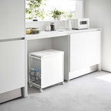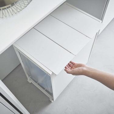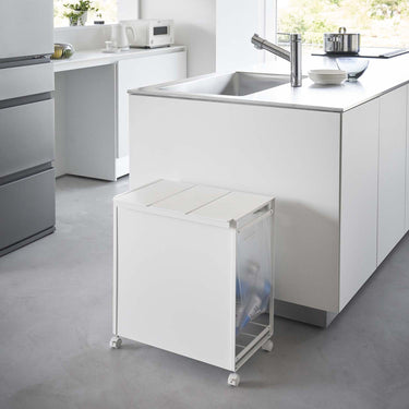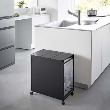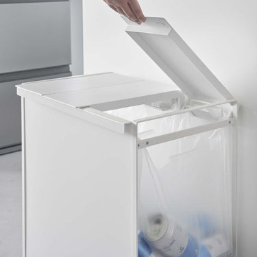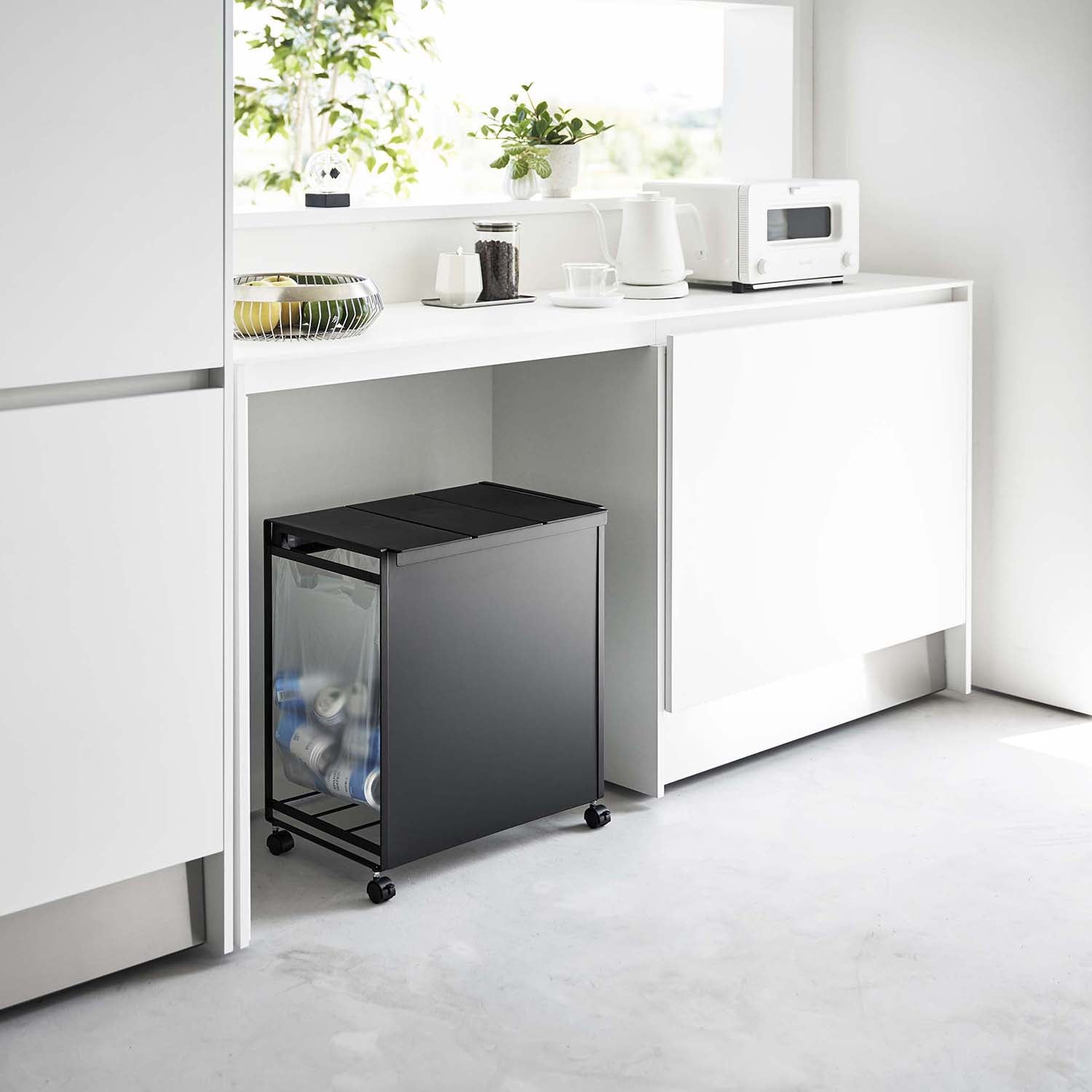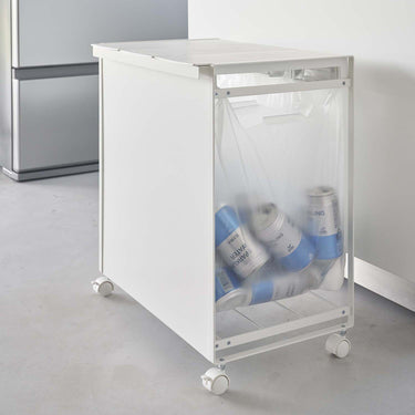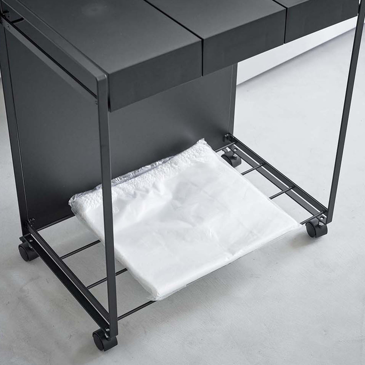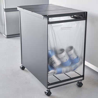 It allows for the separation of items such as bottles, cans, plastic bottles, and plastics. The lid features a silicone stopper that allows it to remain open at 90 degrees. You can use your own convenience store bags, supermarket bags, or garbage bags with handles. It comes with a handle and casters for easy removal of bags and movement during cleaning. The bottom surface is also convenient for storing spare garbage bags.