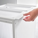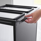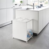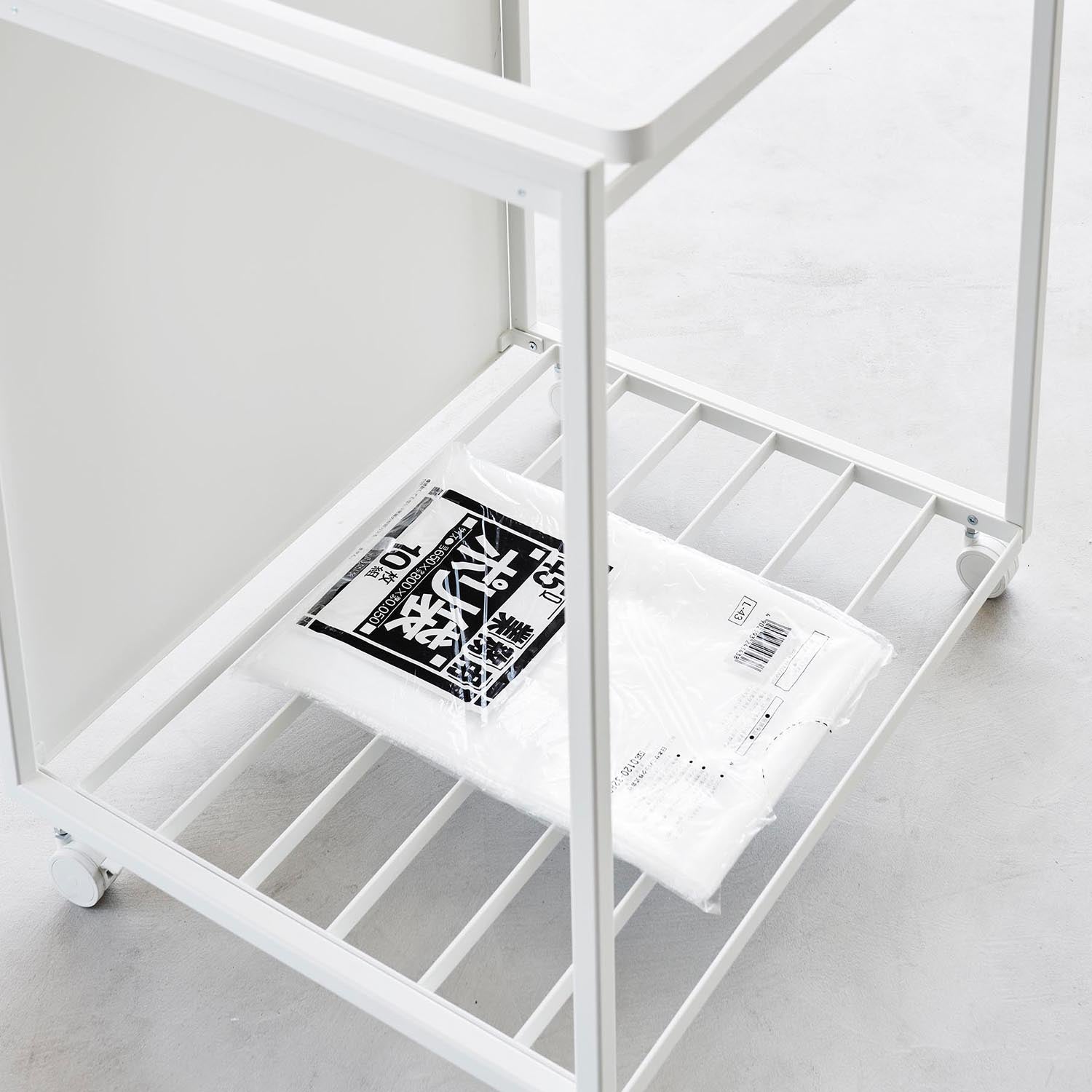 This dustbin allows you to easily sort items such as bottles, cans, plastic bottles, and plastics. Even sorted waste that's difficult to dispose of can be neatly stored under the counter. It's convenient to place next to the kitchen, allowing you to quickly throw away rubbish. There's no need to open a lid, making disposal easy. With a handle, it's easy to move around. Simply remove the stopper and pull towards you to easily change the bin bag. The bottom surface can also be used to store spare bin bags.