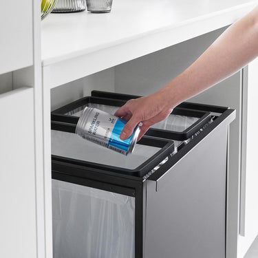 A sorting dustbin that discreetly hides a 45L rubbish bag, allowing for quick and easy disposal.