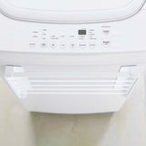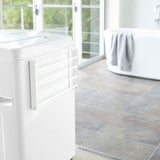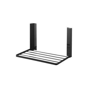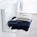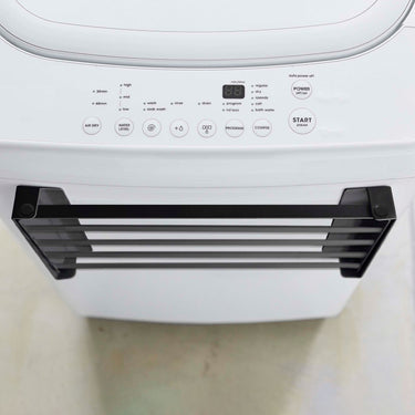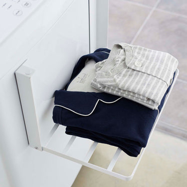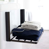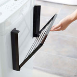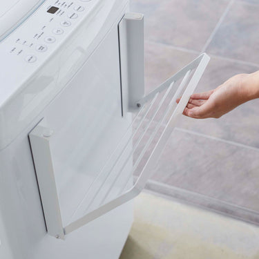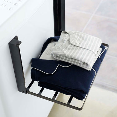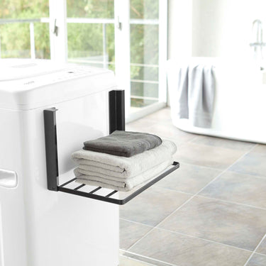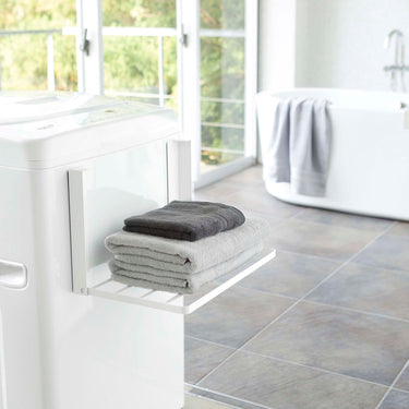 Easily attach to the front or side of your washing machine with magnets! This shelf allows you to temporarily place your bath towels and clothes that you want to use after a bath, which you would otherwise end up placing on top of the washing machine. It's a space-saving foldable shelf that makes temporary storage convenient. The design allows it to stick to curved surfaces as well, so you can attach it to either the front or side of the washing machine. When not in use, it folds up to a slim design with a depth of about 4cm.