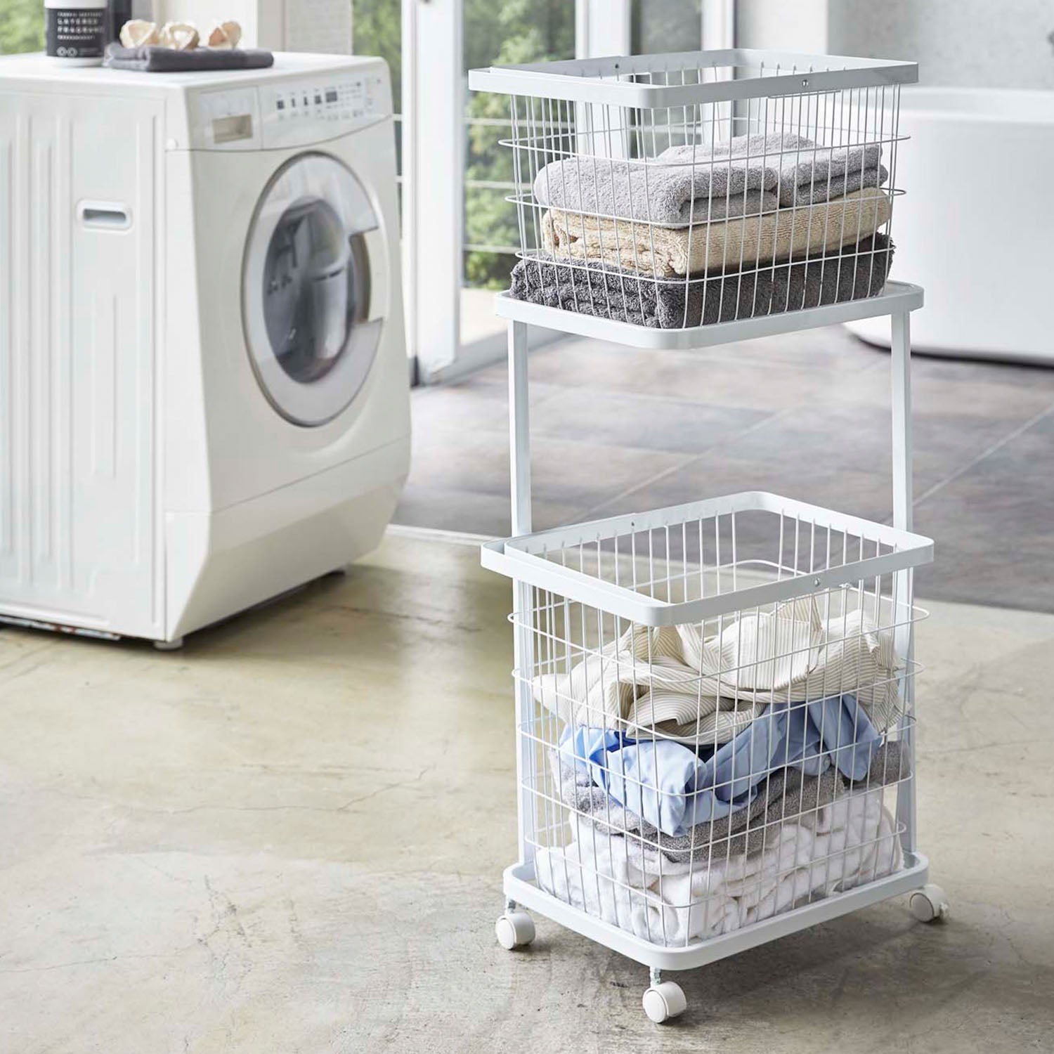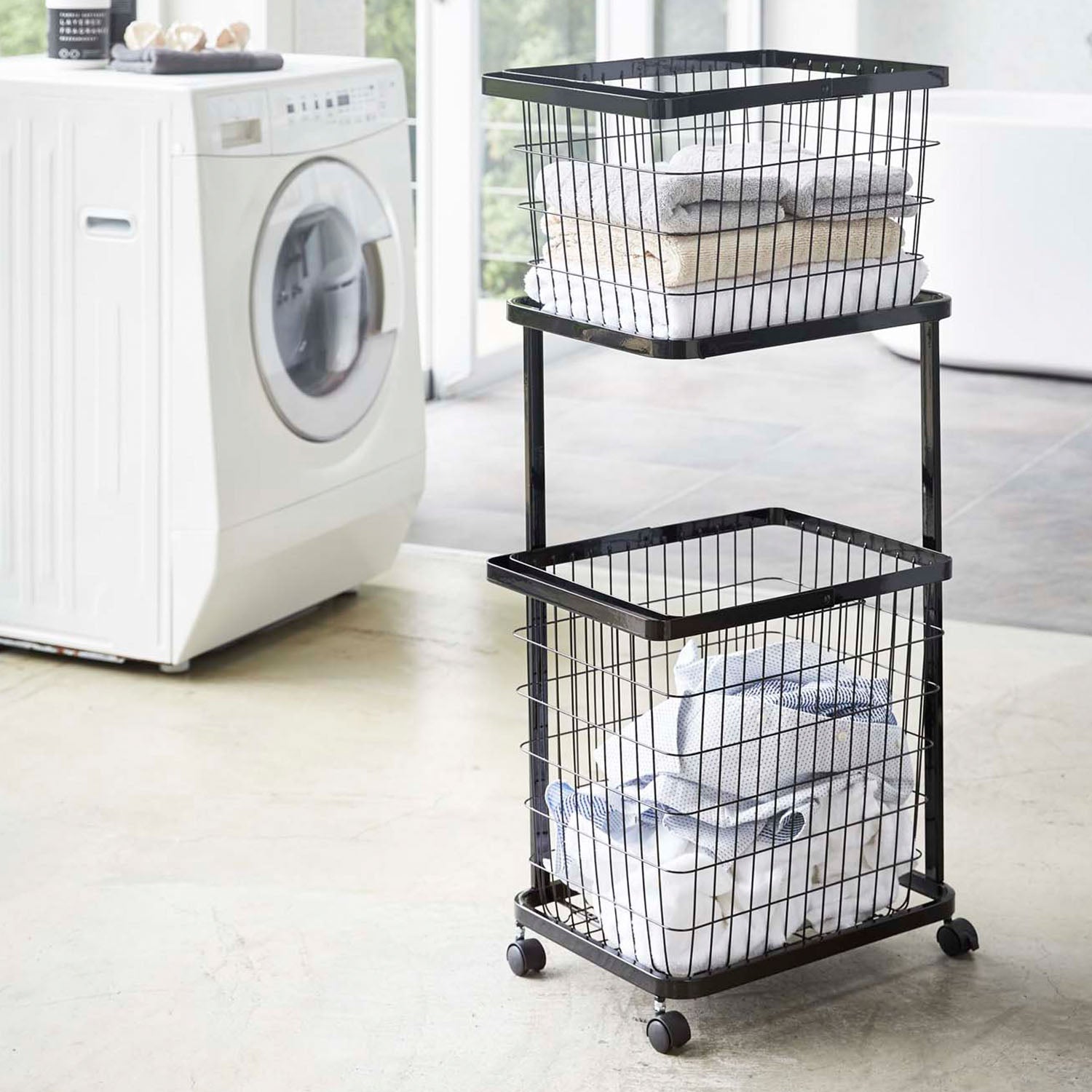 It can accommodate separately sold laundry wire baskets in sizes M & L.