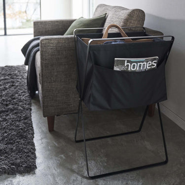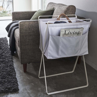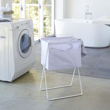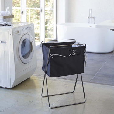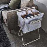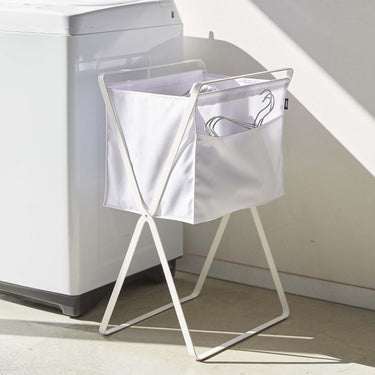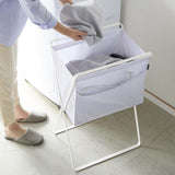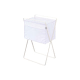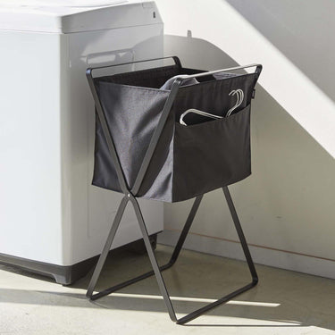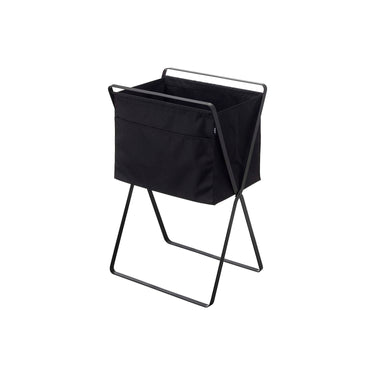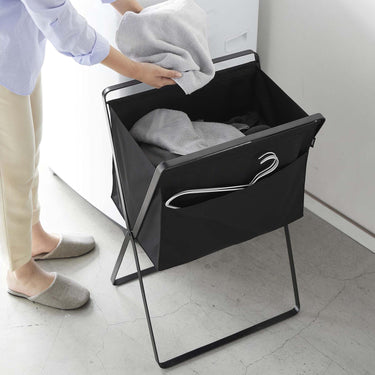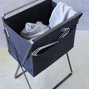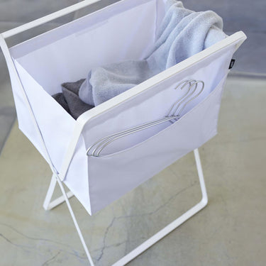 This elevated, foldable laundry basket is designed to reduce strain on your back due to its height, making it easier to load and unload laundry. It features pockets on the side for storing laundry accessories such as hangers. The design also ensures smooth transportation of laundry. When not in use, it can be folded up for slim storage. It's also handy for temporarily storing bags, luggage, or magazines. The basket can be secured to prevent it from opening with a surface fastener.