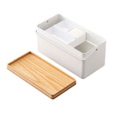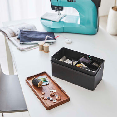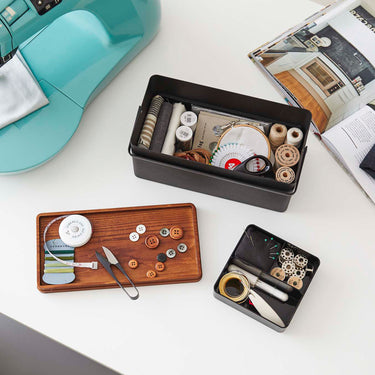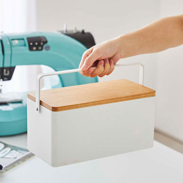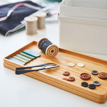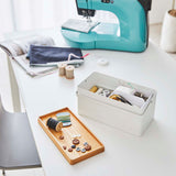 The perfect size for storing your sewing supplies. Conveniently store your sewing tools and use them with ease. The tray can be removed, allowing you to sew without cluttering your tabletop with tools. The top tray is a sliding design, accommodating storage in either vertical or horizontal orientation. The wooden lid can be flipped over and used as a tray. Comes with a handle for easy transport.