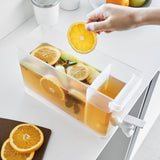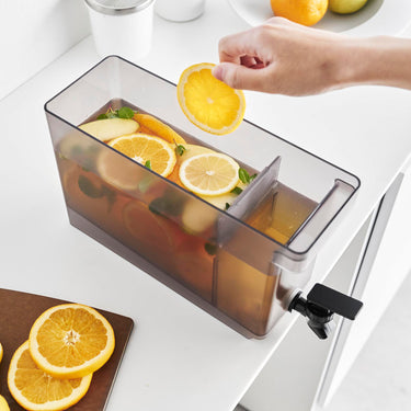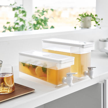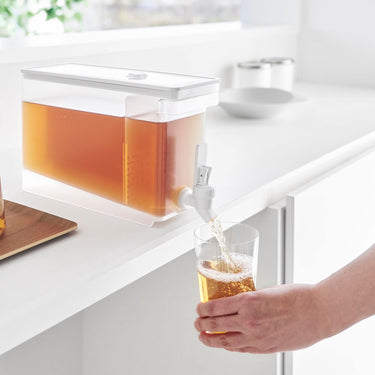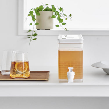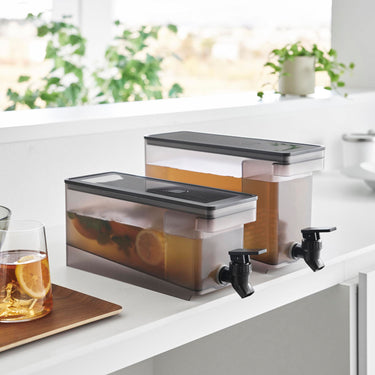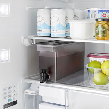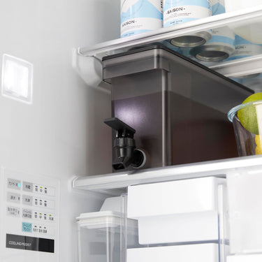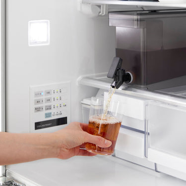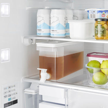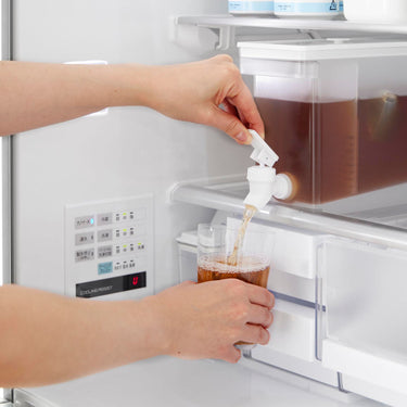This refrigerator drink dispenser allows you to easily pour cold tea just by tilting the lever up and down. It's convenient as you can pour drinks directly from the fridge without removing the water jug. If placed on the kitchen counter, you can easily drink tea or flavoured water at any time. With a large capacity of 2.8L, it's perfect for parties. It has a partition, so tea packs or ingredients for flavoured water won't block the spout, allowing for smooth pouring. The lever can be locked both up and down, and the fact that you can pour without holding the lever is also a handy feature. All parts can be disassembled for cleaning, keeping it hygienic, and it is also dishwasher safe.
