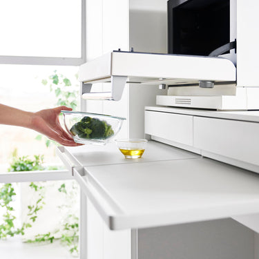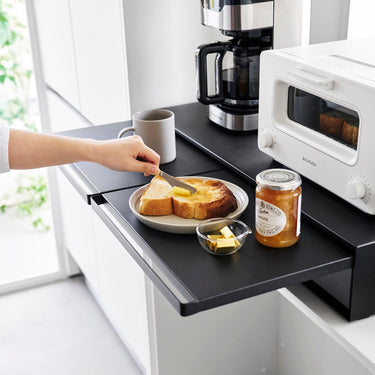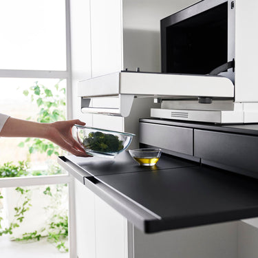 A slide-out table that can be pulled out only when needed for temporary placement of dishes or as a cooking space.