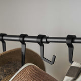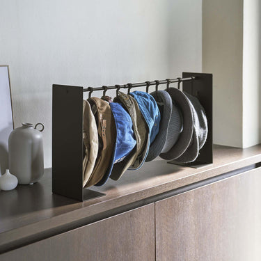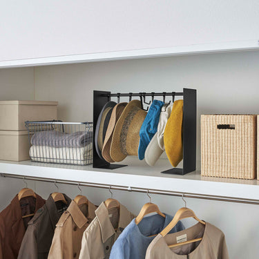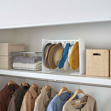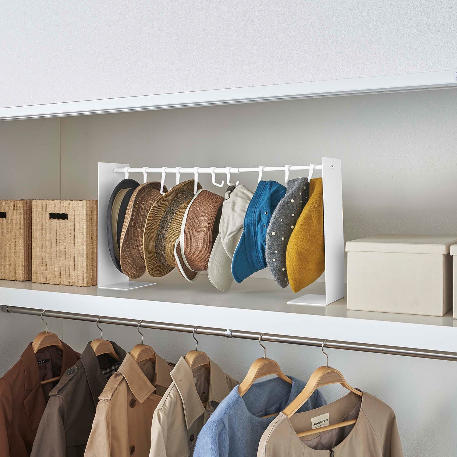 This is a hat storage stand that can adjust its width according to the number of hats and the storage location. It allows you to hang and store hats, preventing them from losing their shape and enabling you to quickly grab the hat you're looking for. It can store up to 10 hats and can be expanded or contracted to fit the desired location and number of hats. It comes with two sizes of hooks, S and L, which can be chosen according to the hat. The hooks can be attached at any position you prefer.