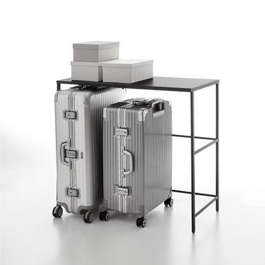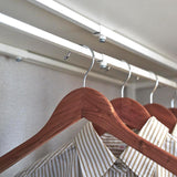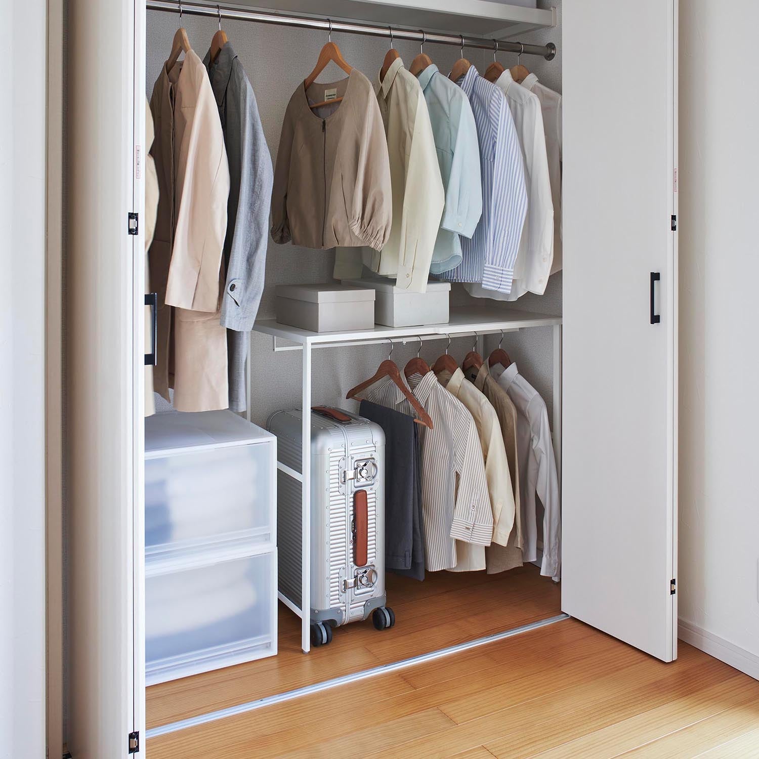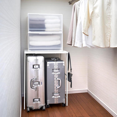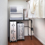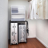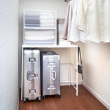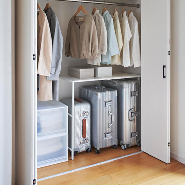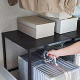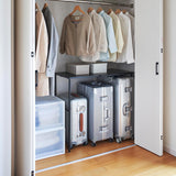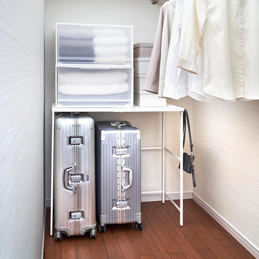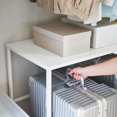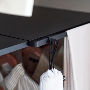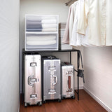 It's extendable, so it fits perfectly in your storage space. Ideal for walk-in closets or wardrobes. The top of your suitcase becomes a storage space for clothes and small items. You can also hang clothes for outstanding storage capacity. The width can be adjusted between approximately 51-92cm. Even with a large suitcase, it's at a height that allows easy access. You can hang hangers on the back of the top board for clothes storage. Hooks can be hung on the handle of the top board for storing travel accessories and the like.