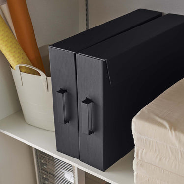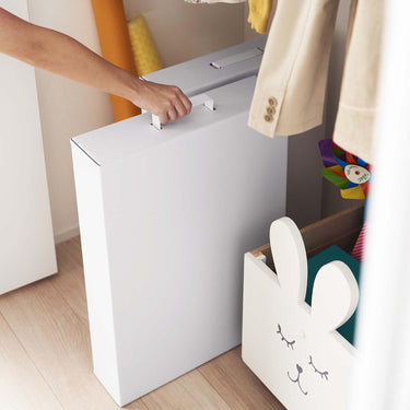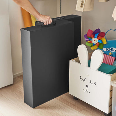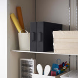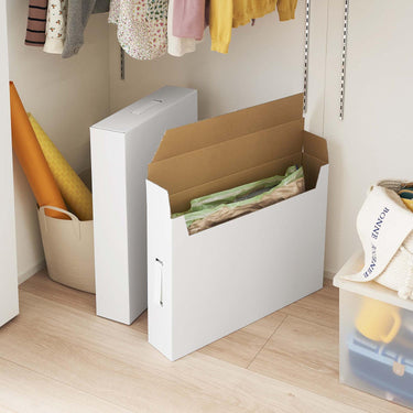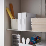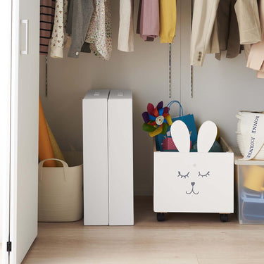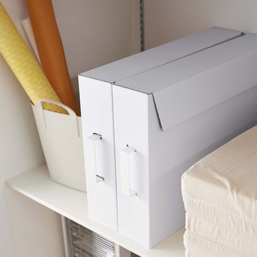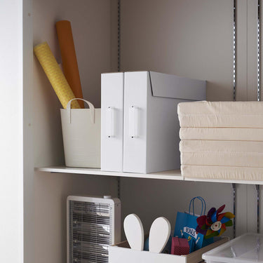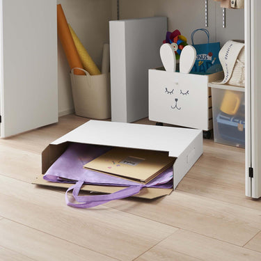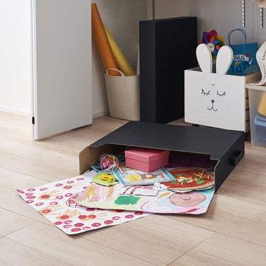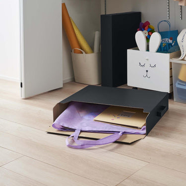 This large capacity storage box can be used vertically or horizontally. It's perfect for storing your child's three-dimensional artworks. It can also accommodate your child's A2 size art bag as it is. With its large capacity, it can also store seasonal items and vacuum-sealed bags. It comes with a reinforcing sticker that can be attached to the handle slot.